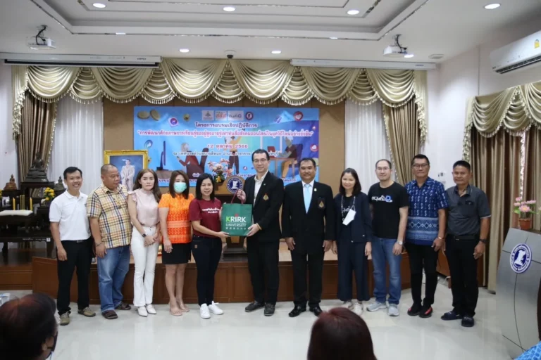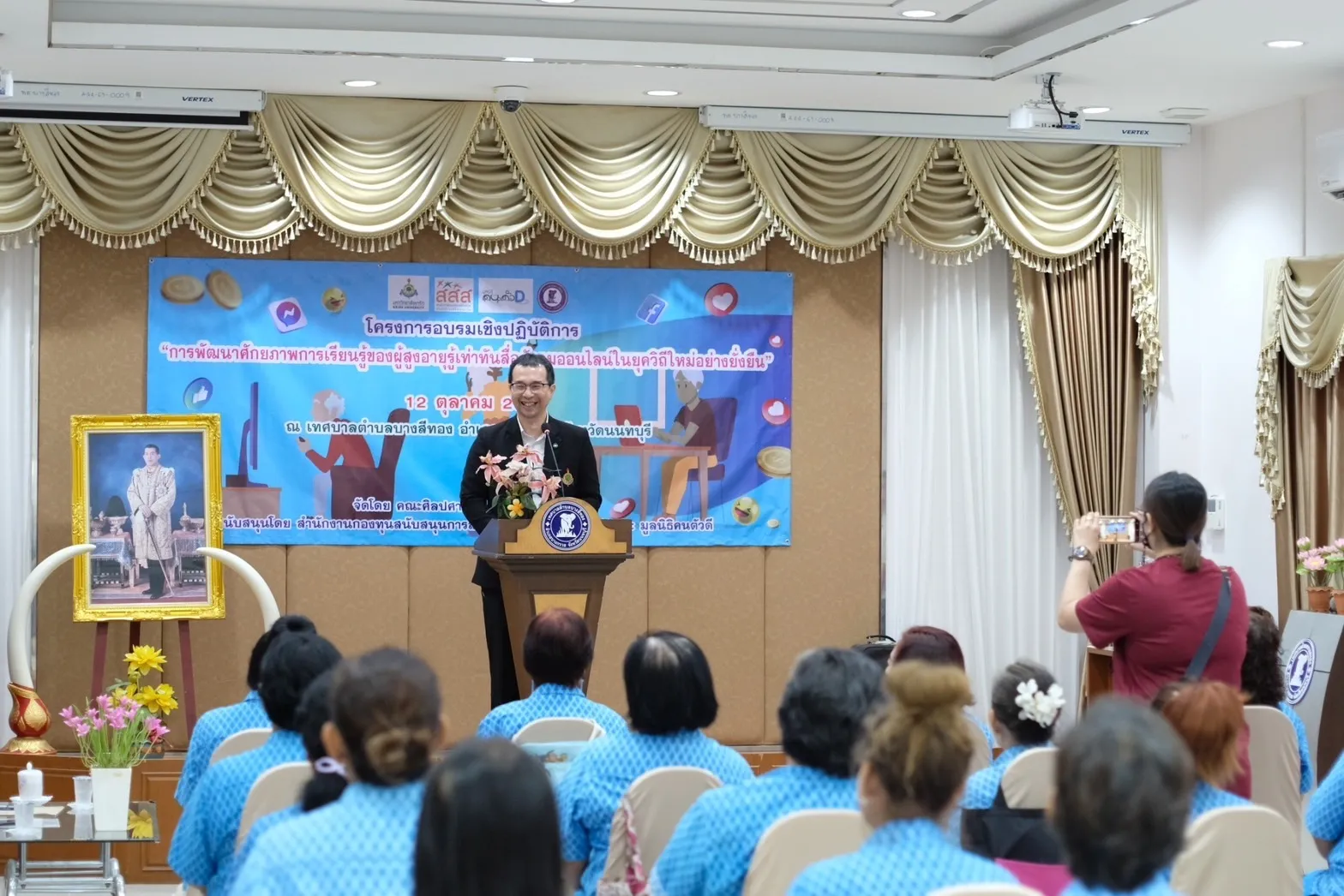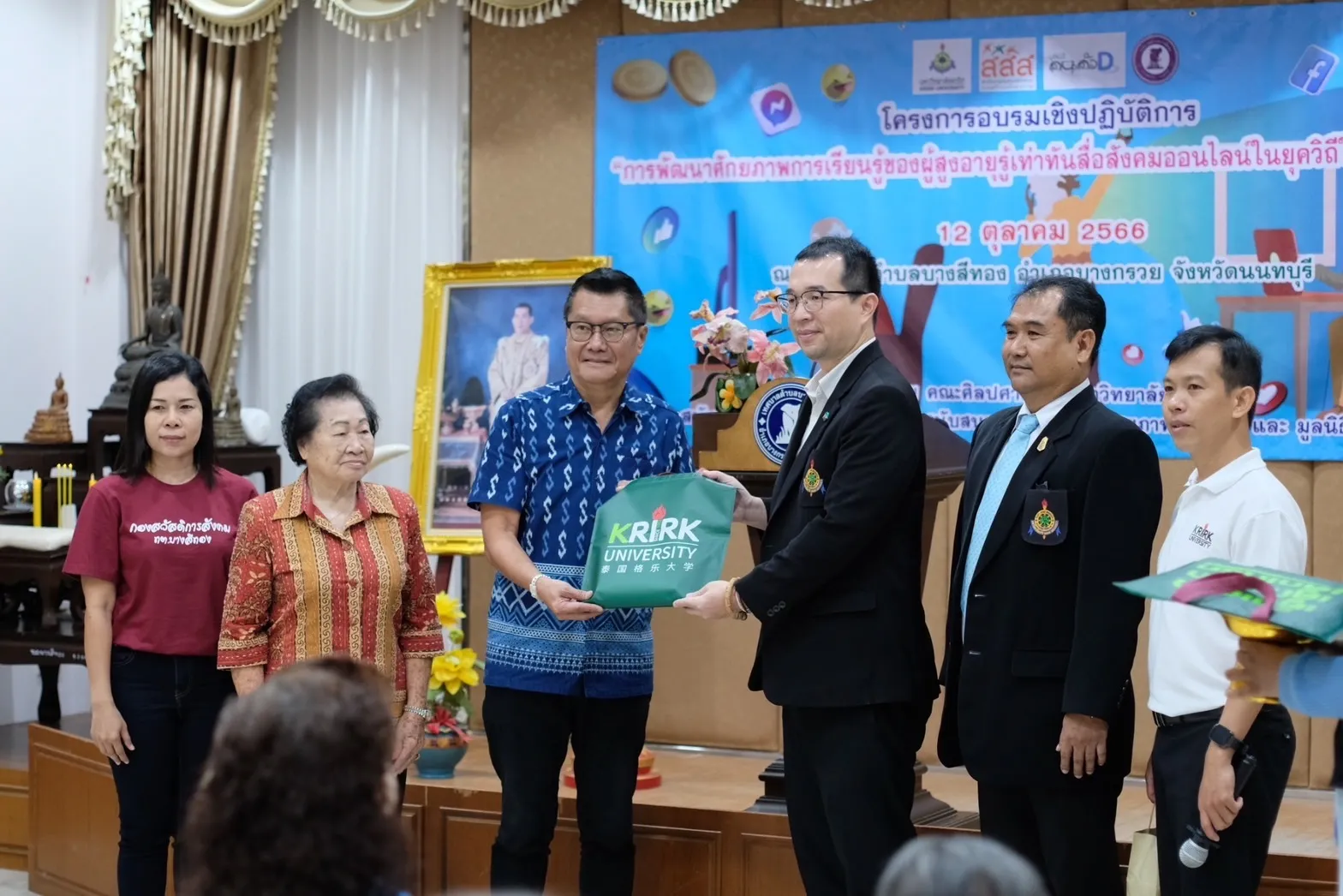 เมื่อวันพฤหัสบดีที่ 12 ตุลาคม 2566 คณะศิลปศาสตร์ มหาวิทยาลัยเกริก ร่วมกับ มูลนิธิคนตัวดี บริษัท ทำมาปัน จำกัด กรมกิจการผู้สูงอายุ สำนักงานกองทุนสนับสนุนการสร้างเสริมสุขภาพ (สสส.) จัดโครงการอบรมเชิงปฏิบัติการ “การพัฒนาศักยภาพการเรียนรู้ของผู้สูงอายุ รู้เท่าทันสื่อสังคมออนไลน์ ในยุควิถีใหม่อย่างยั่งยืน” ณ เทศบาลตำบลบางสีทอง อำเภอบางกรวย จังหวัดนนทบุรี โดยมี นายกเทศมนตรีเทศบาลตำบลบางสีทอง กล่าวต้อนรับคณะผู้บริหาร พร้อมด้วย DR. MING HSUN HSIE คณบดีคณะศิลปศาสตร์ มหาวิทยาลัยเกริก เป็นประธานในพิธีเปิดกิจกรรม โดยมีวัตถุประสงค์ เพื่อให้ผู้สูงอายุมีความรู้การใช้เทคโนโลยีในชีวิตประจำวันและการสื่อสารได้อย่างปลอดภัย และเกิดทักษะการรู้เท่าทันสื่อสังคมออนไลน์ การจัดกิจกรรมในครั้งนี้ได้รับความอนุเคราะห์จากผู้บริหารเทศบาลตำบลบางสีทอง ให้ความอนุเคราะห์สถานที่และสนับสนุนให้ผู้สูงอายุเข้าร่วมกิจกรรม หลังจากการจัดกิจกรรมเทศบาลตำบลบางสีทองได้หารือร่วมกับคณะศิลปศาสตร์ ถึงแนวทางในการขับเคลื่อนโครงการพัฒนาพื้นที่ตำบลบางสีทอง ในปีงบประมาณ 2566 เพื่อยกระดับคุณภาพชีวิตของชุมชนต่อไป