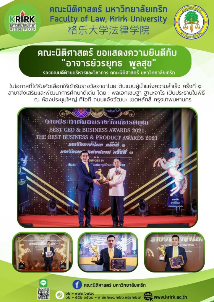 มหาวิทยาลัยเกริกขอแสดงความยินดีกับ อาจารย์วรยุทร พูลสุข รองคณบดีฝ่ายบริหารและวิชาการ คณะนิติศาสตร์ มหาวิทยาลัยเกริก ที่ได้รับรางวัลอาชาไนย ต้นแบบผู้นำความสำเร็จ ครั้งที่ 1 สาขาส่งเสริมและพัฒนาการศึกษาดีเด่น #มหาวิทยาลัยเกริก #KrirkUniversity #นิติศาสตร์มหาวิทยาลัยเกริก #เรียนกฏหมาย #เรียนภาษาจีน