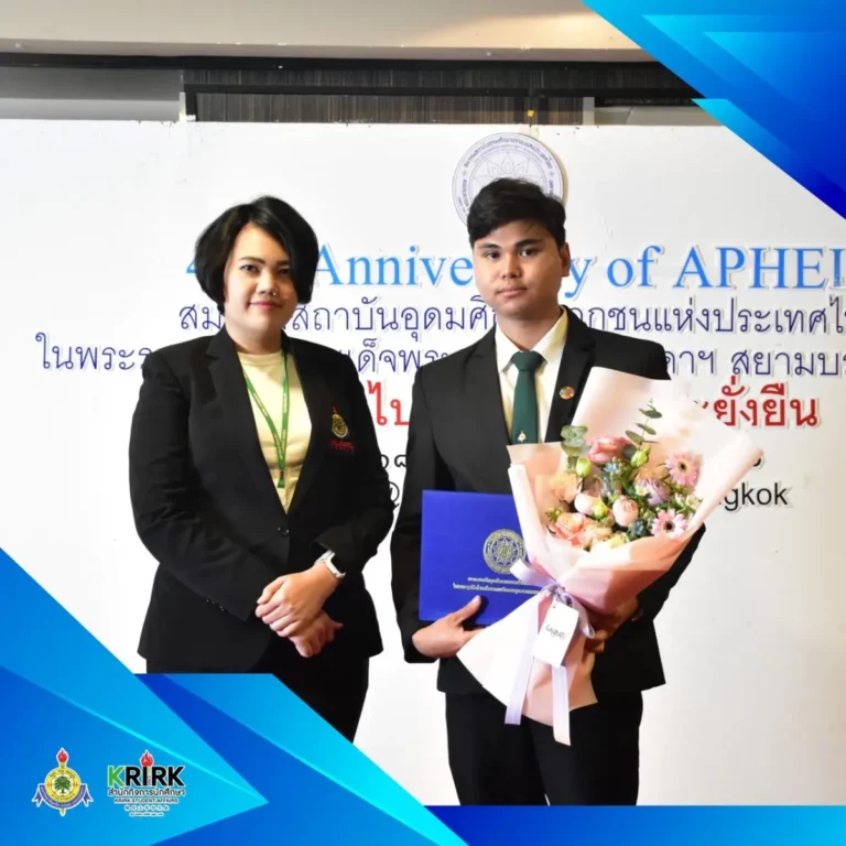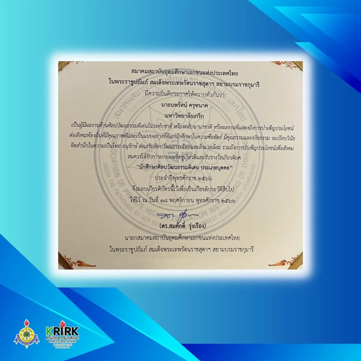 นายนพรัตน์ ครุฑนาค นักศึกษาชั้นปีที่ 3 คณะนิติศาสตร์ มหาวิทยาลัยเกริก เข้ารับรางวัลนักศึกษาดีเด่น ด้านศิลปวัฒนธรรมดีเด่น จัดโดย สมาคมสถาบันอุดมศึกษาเอกชนแห่งประเทศไทย ในพระบรมราชูปถัมภ์สมเด็จพระเทพรัตนราชสุดาฯ สยามบรมราชกุมารี
