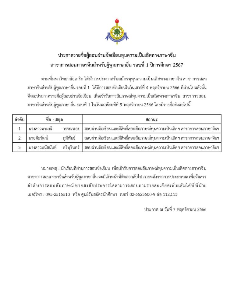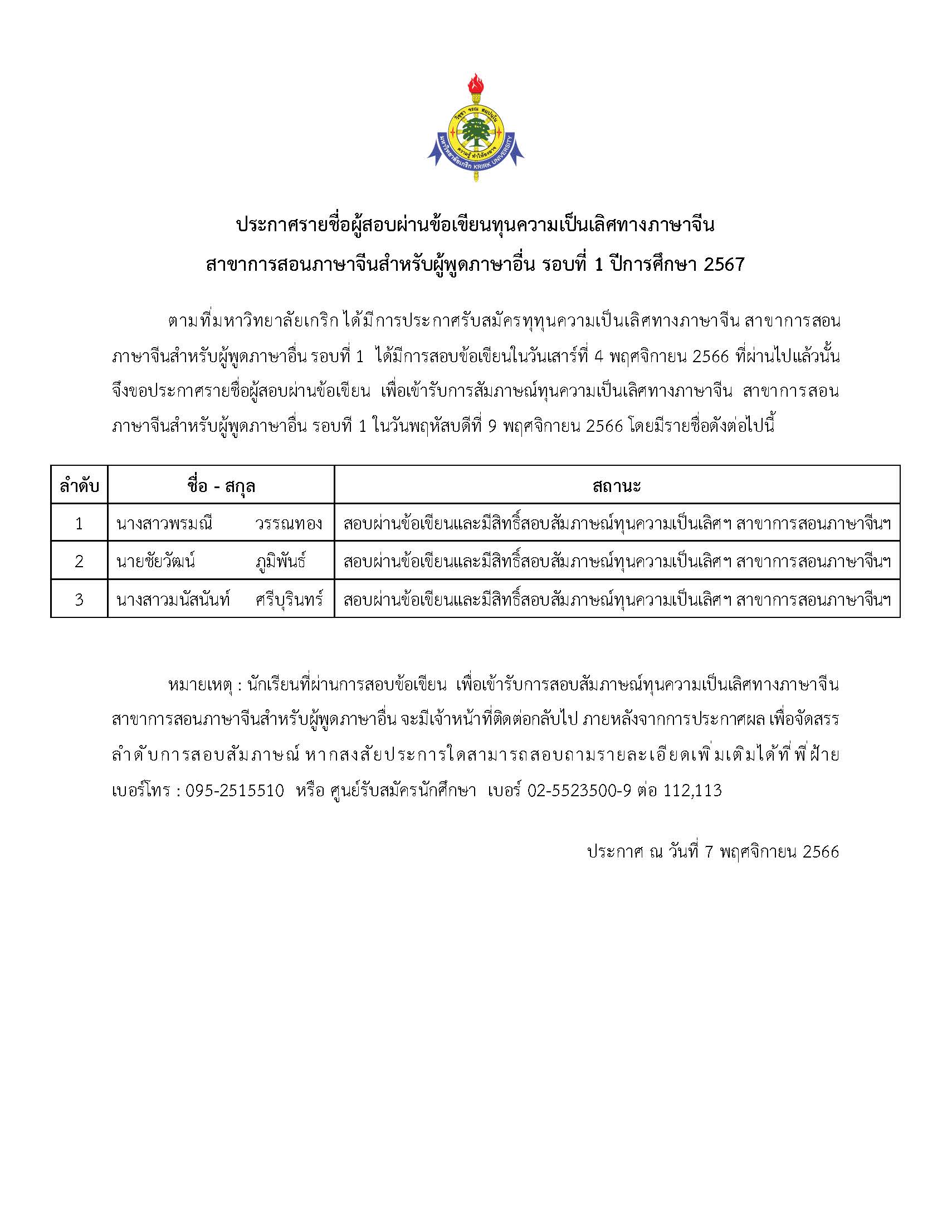 หมายเหตุ : นักเรียนที่ผ่านการสอบข้อเขียน เพื่อเข้ารับการสอบสัมภาษณ์ทุนความเป็นเลิศทางภาษาจีน สาขาการสอนภาษาจีนสำหรับผู้พูดภาษาอื่น จะมีเจ้าหน้าที่ติดต่อกลับไป ภายหลังจากการประกาศผล เพื่อจัดสรรลำดับการสอบสัมภาษณ์ หากสงสัยประการใดสามารถสอบถามรายละเอียดเพิ่มเติมได้ที่พี่ฝ้าย เบอร์โทร : 095-2515510 หรือ ศูนย์รับสมัครนักศึกษา เบอร์ 02-5523500-9 ต่อ 112,113