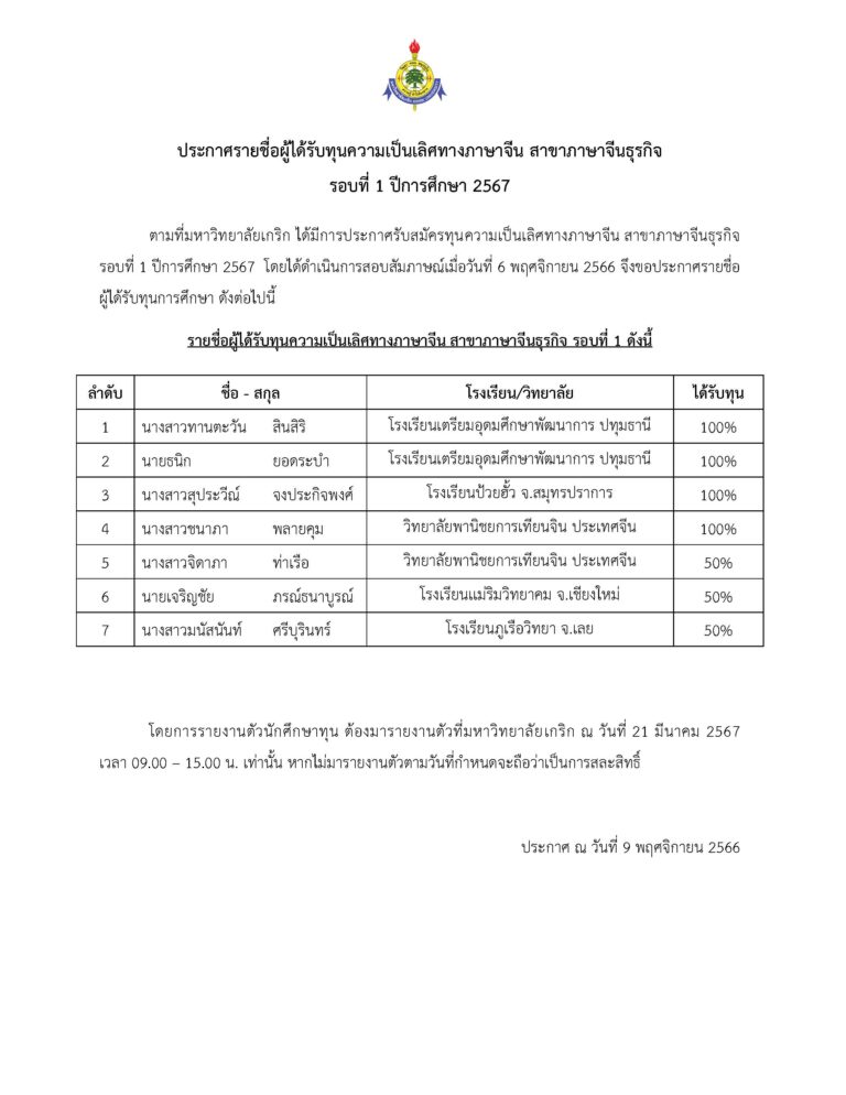 ตามที่มหาวิทยาลัยเกริก ได้มีการประกาศรับสมัครทุนความเป็นเลิศทางภาษาจีน สาขาภาษาจีนธุรกิจรอบที่ 1 ปีการศึกษา 2567 โดยได้ดาเนินการสอบสัมภาษณ์เมื่อวันที่ 6 พฤศจิกายน 2566 จึงขอประกาศรายชื่อผู้ได้รับทุนการศึกษา ดังต่อไปนี้