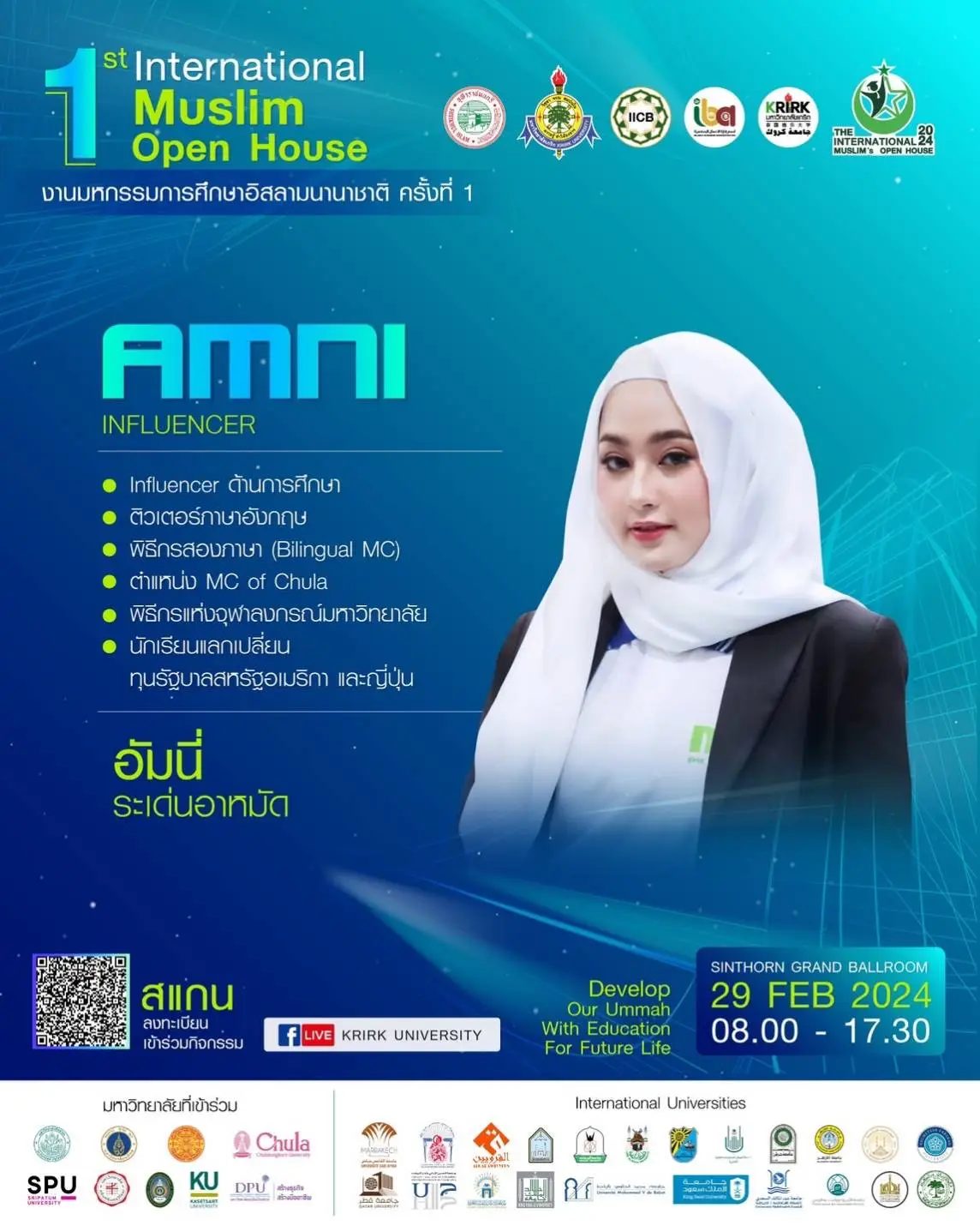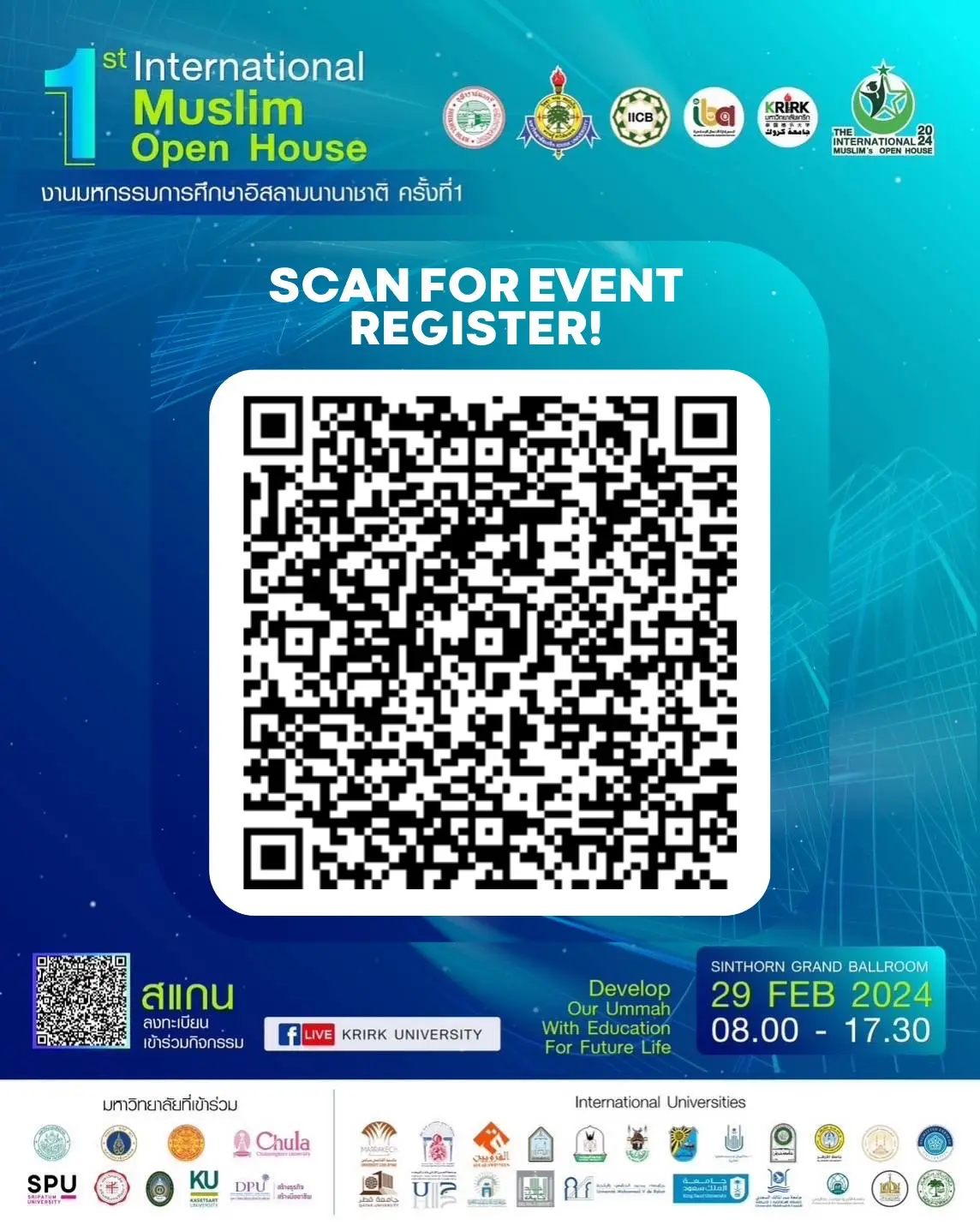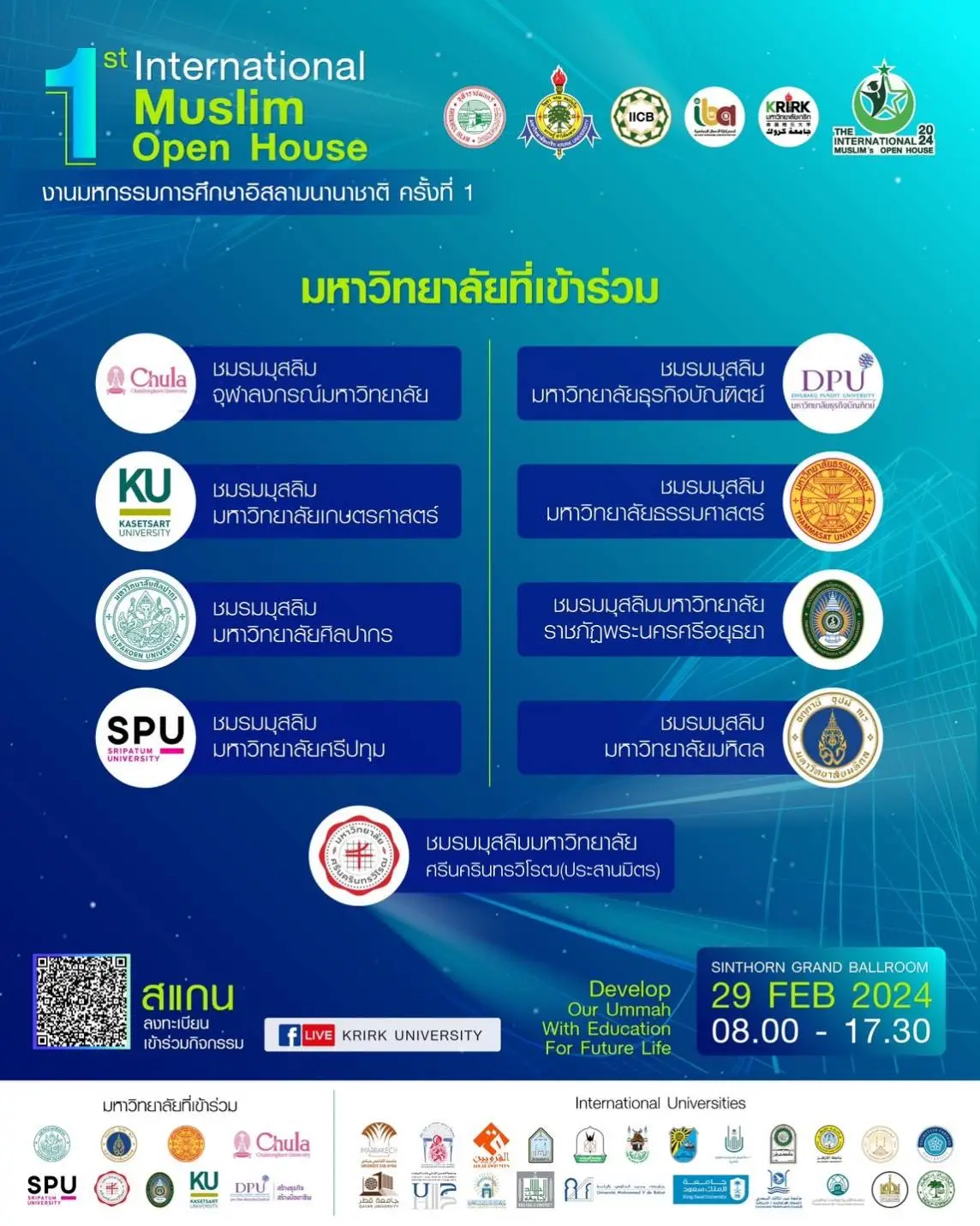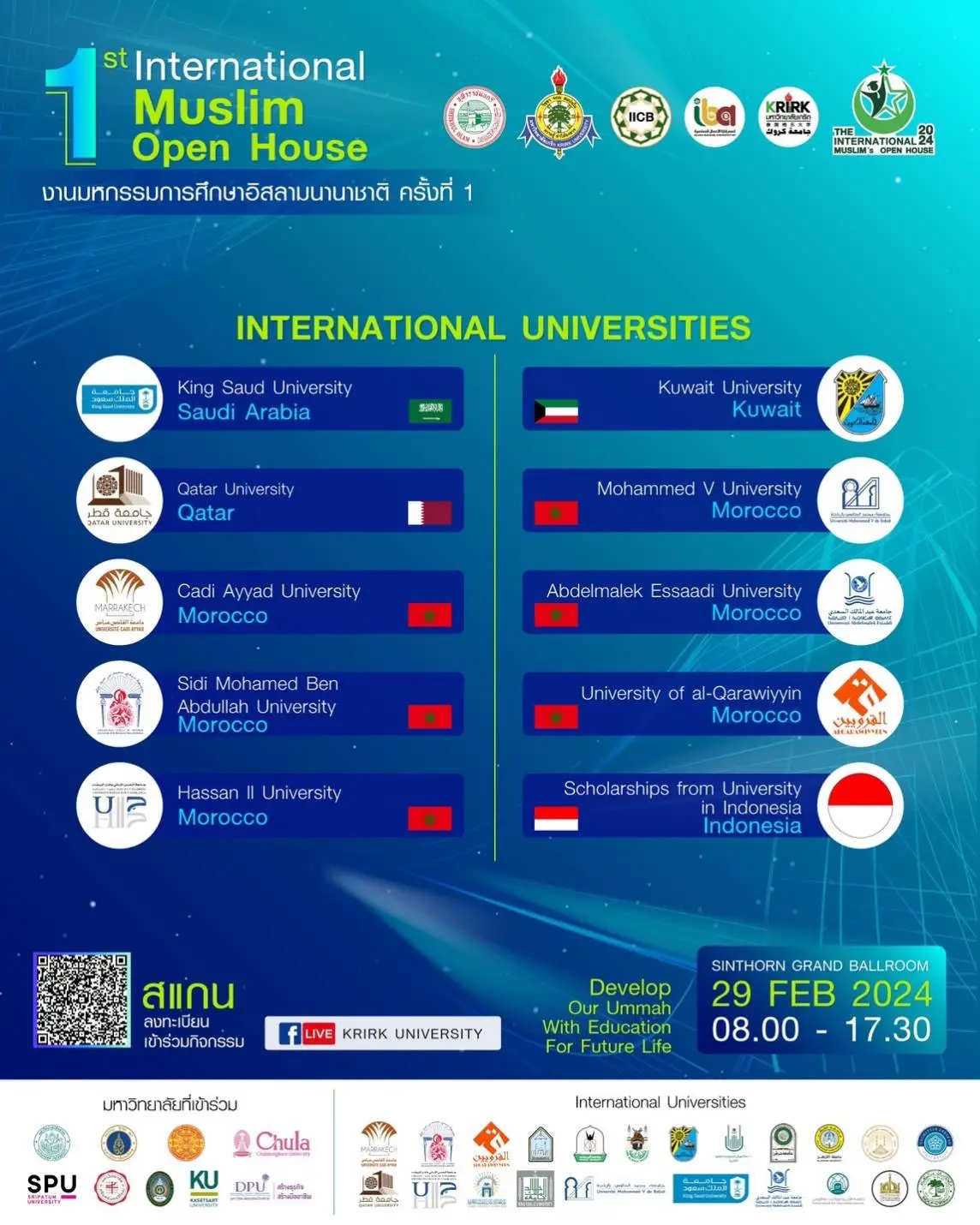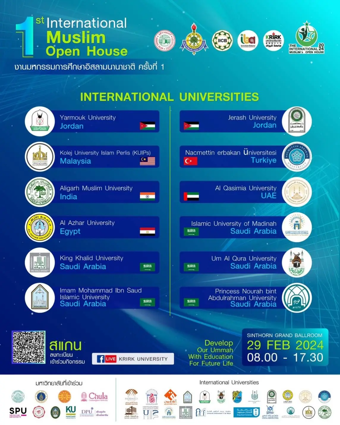 กับการรวมตัวของเหล่ามหาวิทยาลัยชั้นนำ ทั้งในและต่างประเทศ มากกว่า 30 แห่ง !!! อาทิ มหาลัยใน UAE Saudi Arabia Qatar Kuwait Jordan Morocco Egypt Turkey Malaysia India Indonesia !! จุฬาลงกรณ์ฯ ม.ธรรมศาสตร์ ม.มหิดล ม.ศิลปากร ม.ศรีนครินทรวิโรฒ และมหาลัยชั้นนำต่างๆ