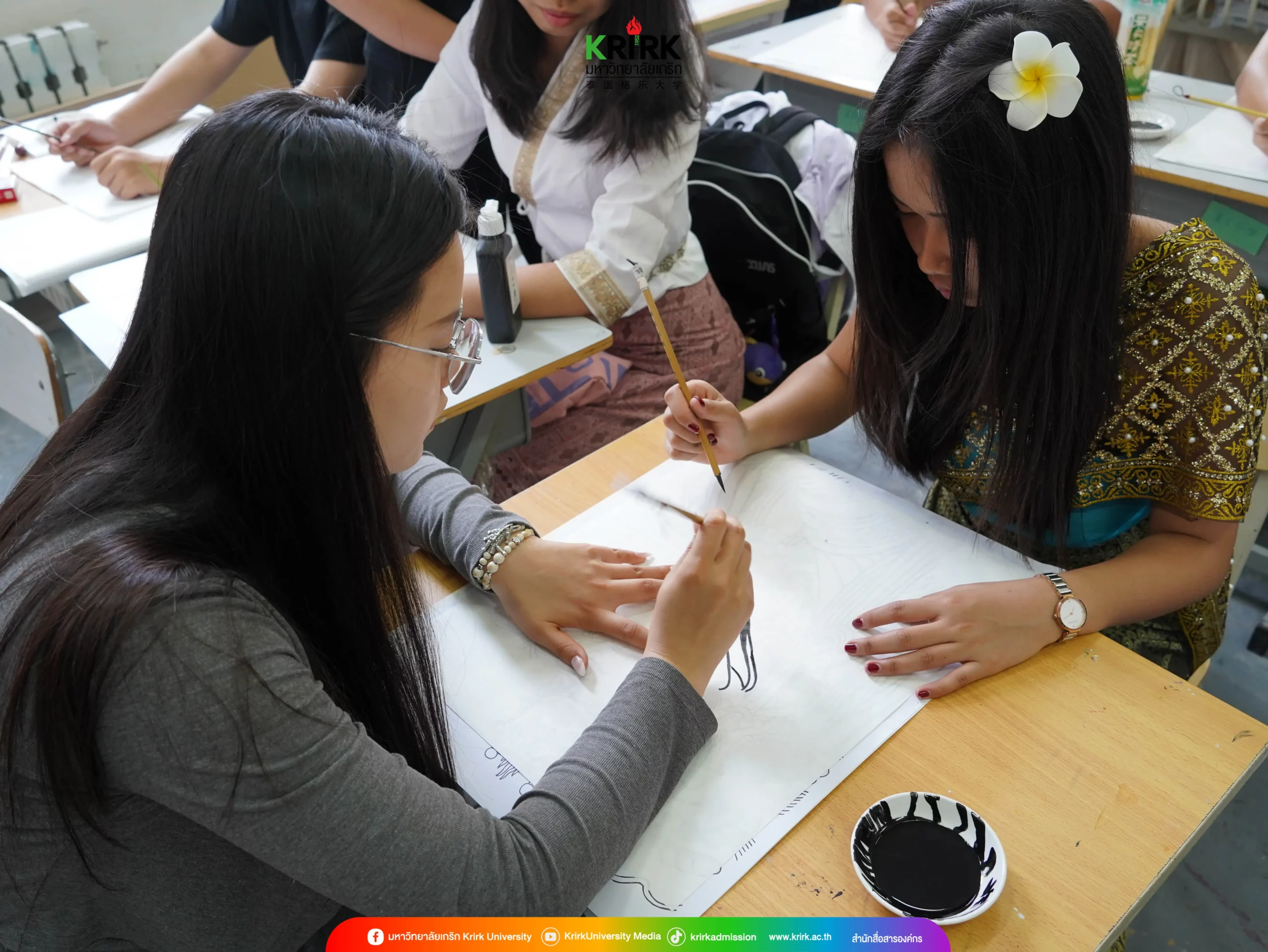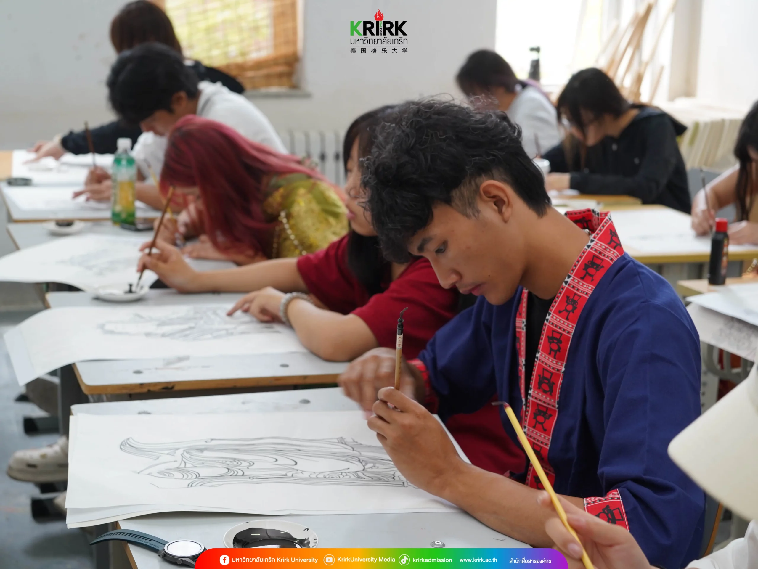 ช่วงเช้าวันที่ 12 มิถุนายน 2567 ที่ผ่านมา นักศึกษาแลกเปลี่ยนระยะสั้น กลุ่มที่ 4 ของมหาวิทยาลัยเกริกได้เข้าร่วมการเรียนวิชาการวาดภาพจิตรกรรมฝาผนังจีน (Chinese Mural Painting) ร่วมกับนักศึกษาจาก Dalian Art College นักศึกษาได้เรียนรู้ศิลปะการวาดภาพฝาผนังแบบจีน ซึ่งเป็นศิลปะที่มีความสำคัญและมีประวัติศาสตร์อันยาวนาน