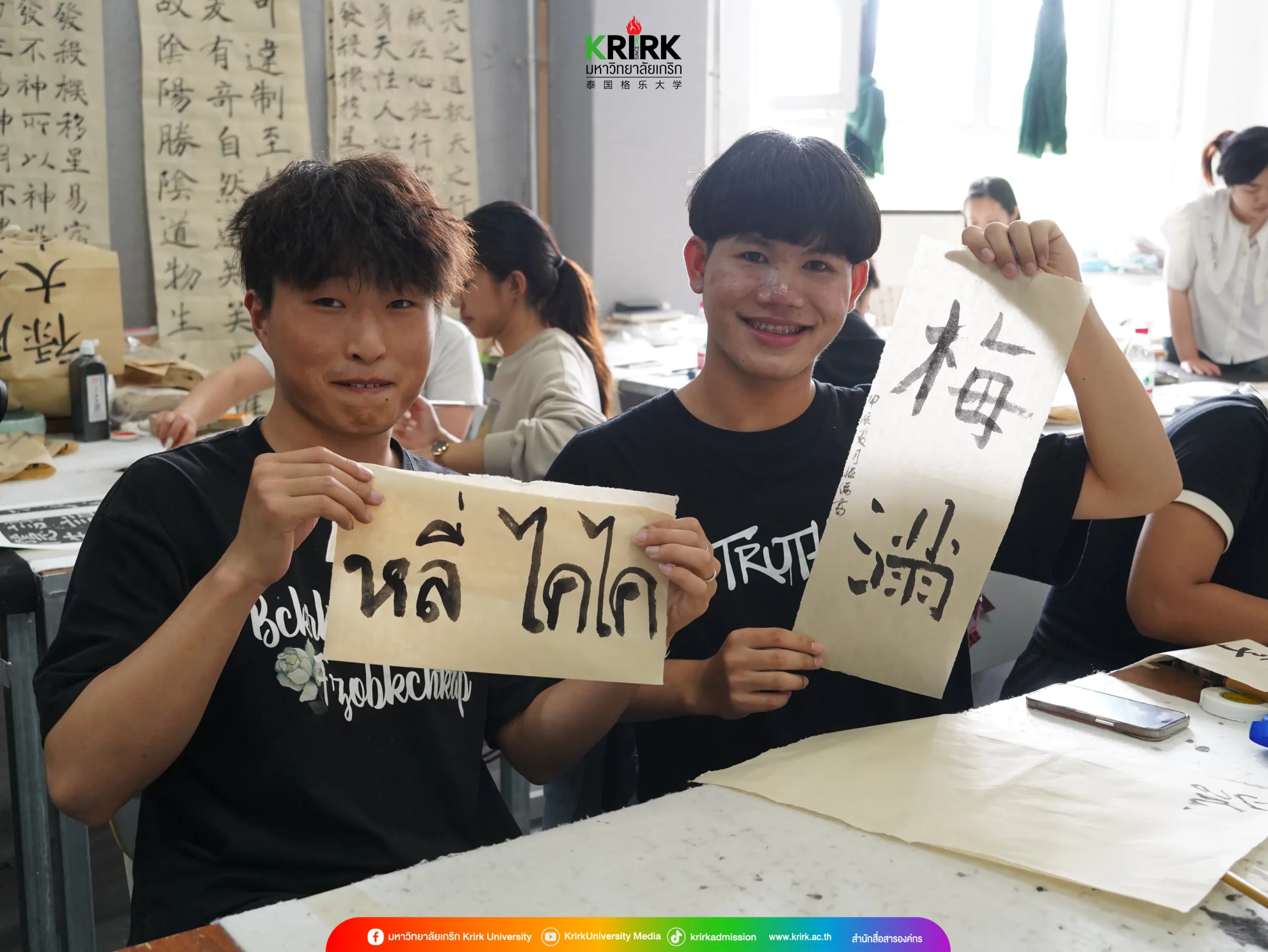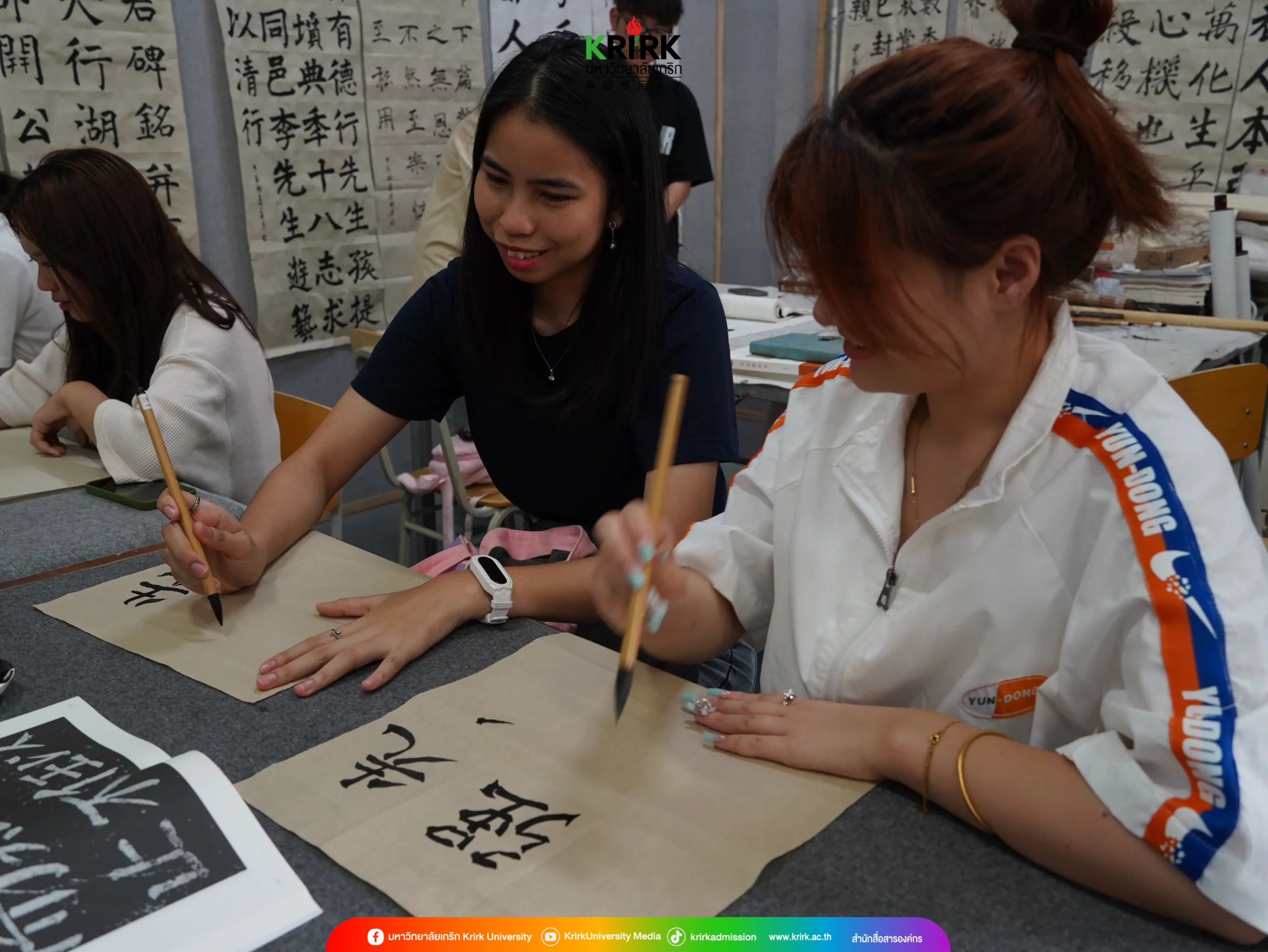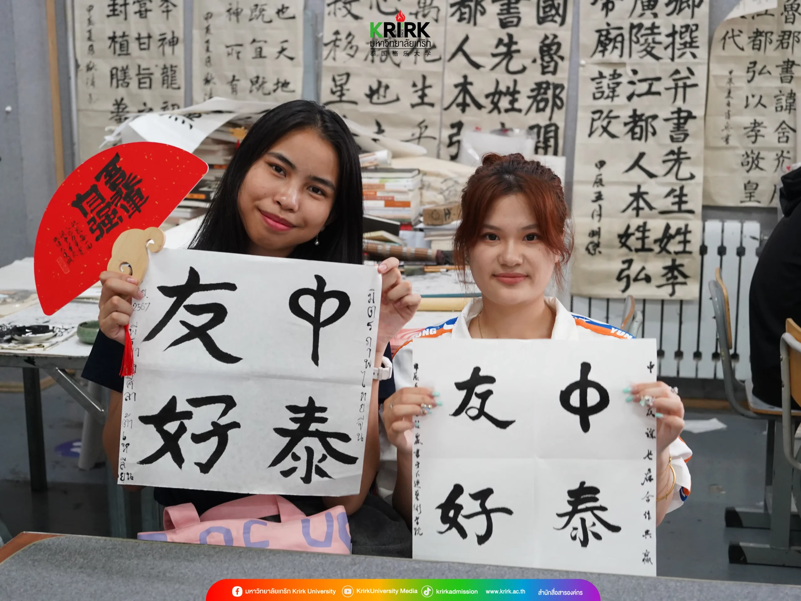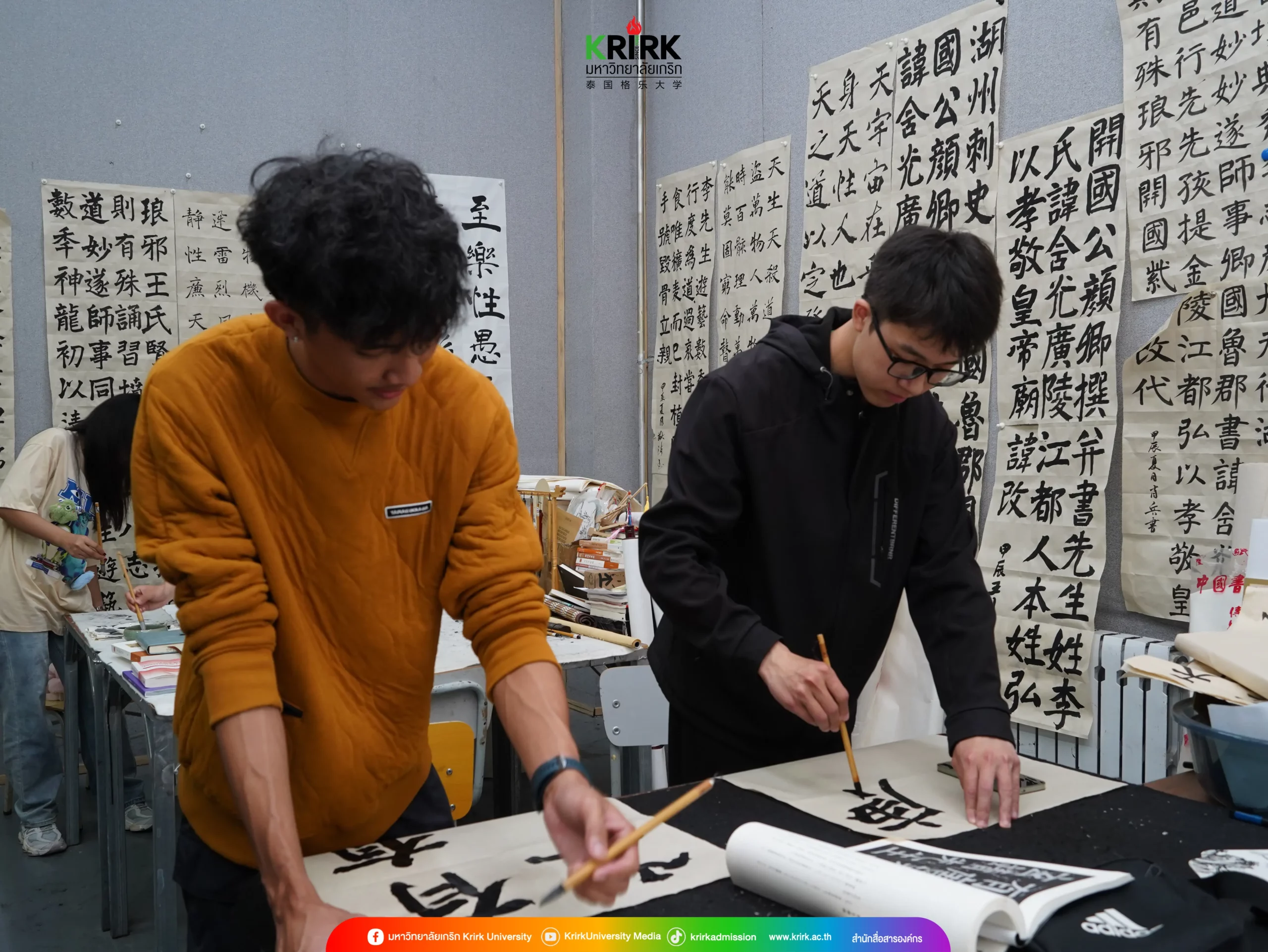 ในช่วงบ่ายวันเดียวกัน นักศึกษาได้เข้าร่วมการเรียนการเขียนตัวอักษรด้วยพู่กันจีน โดยมีนักศึกษาไทยและจีนนั่งเรียนร่วมกัน พวกเขาได้ฝึกเขียนตัวอักษรจีน โดยมีนักศึกษาชาวจีนเป็นผู้ช่วยสอนในการเขียนตัวอักษรจีนด้วยพู่กันให้ถูกต้อง โดยมีอาจารย์ผู้เชียวชาญคอยดูแล และคอยแนะนำเทคนิคต่าง ๆ ให้นักศึกษาได้เข้าใจ ภายในห้องเรียนยังได้มีการแลกเปลี่ยนกันเขียนชื่อตัวเองเป็นภาษาไทยและจีน และแลกเปลี่ยนชื่อกันในภาษาของอีกฝ่ายหนึ่ง กิจกรรมนี้ไม่เพียงแต่ช่วยเสริมทักษะการเขียนพู่กันจีน แต่ยังเป็นโอกาสในการแลกเปลี่ยนวัฒนธรรมและสร้างความเข้าใจระหว่างนักศึกษาทั้งสองประเทศ