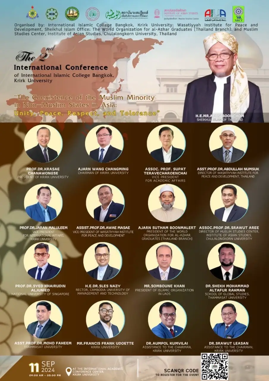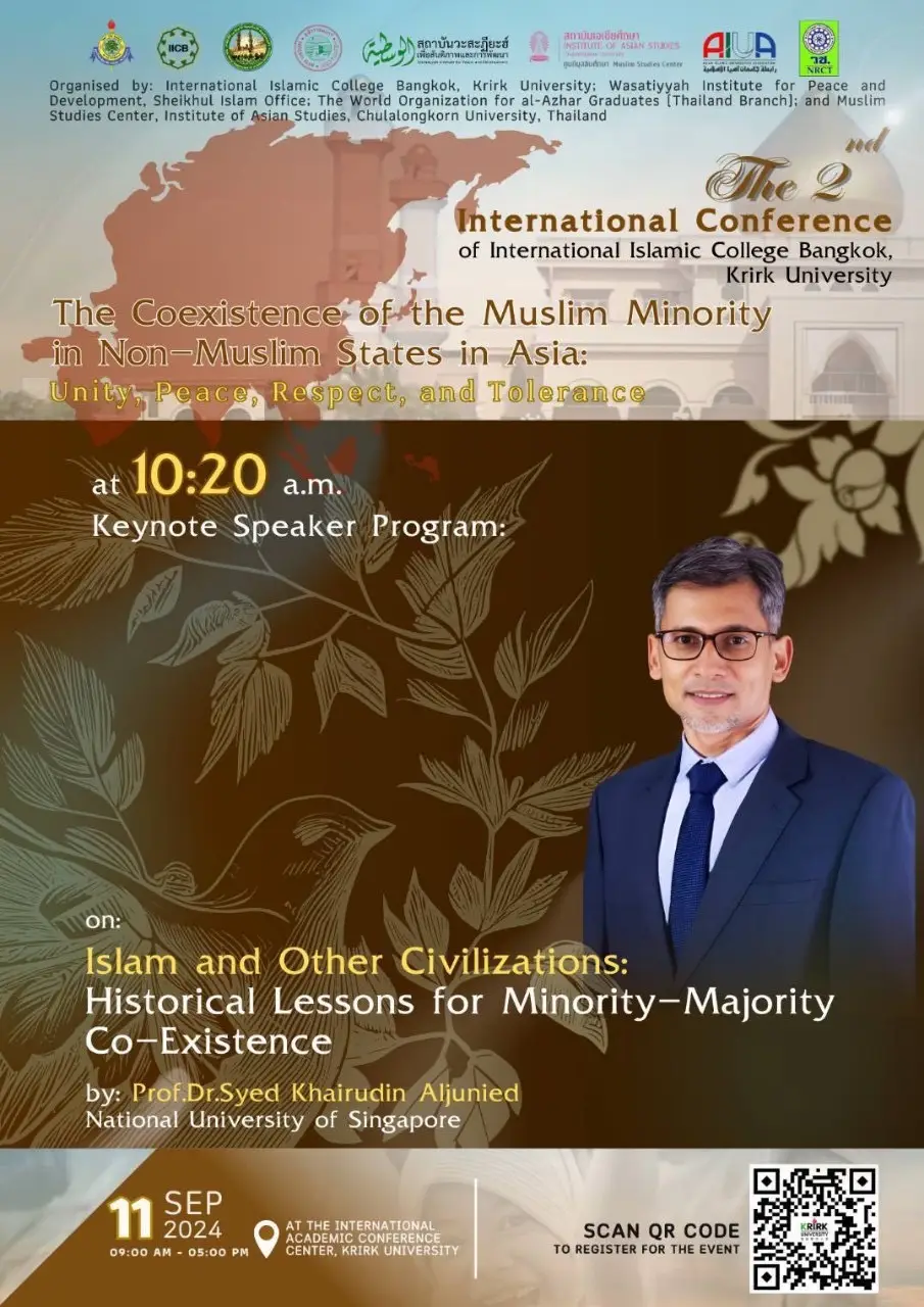 วิทยาลัยนานาชาติอิสลามกรุงเทพ มหาวิทยาลัยเกริก ร่วมกับ สถาบันวะสะฏียะฮ์เพื่อสันติภาพและการพัฒนา สำนักจุฬาราชมนตรี สมาพันธ์ศิษย์เก่าอัล-อัซฮัรโลก สาขาประเทศไทย ศูนย์มุสลิมศึกษา สถาบันเอเชียศึกษา จุฬาลงกรณ์มหาวิทยาลัย สำนักงานการวิจัยแห่งชาติ และสมาคมมหาวิทยาลัยมุสลิมแห่งเอเชีย ขอเรียนเชิญท่านผู้มีเกียรติทุก ๆ ท่านร่วมงานประชุมวิชาการนานาชาติอิสลามกรุงเทพ ครั้งที่ 2 เรื่อง “การอยู่ร่วมกันของชนกลุ่มน้อยมุสลิมในกลุ่มประเทศ Non-Islamic States : เอกภาพ สันติภาพ การเคารพ และความเข้าใจซึ่งกันและกัน” ในวันพุธที่ 11 กันยายน 2567 ณ ห้องประชุมวิชาการนานาชาติ อาคาร 2 ชั้น 1 มหาวิทยาลัยเกริก