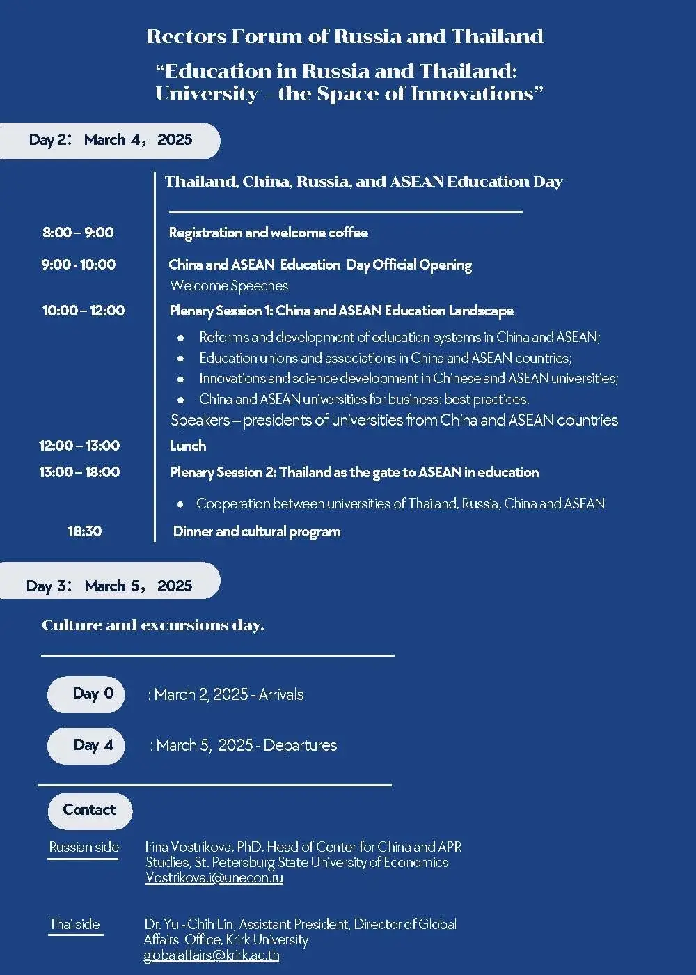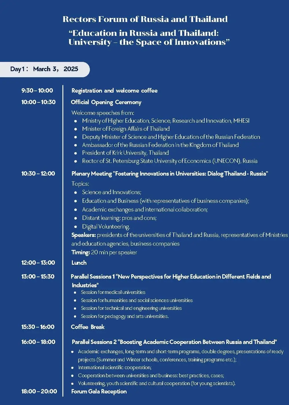 ✅หัวข้อการประชุม: “การประชุมผู้บริหารรัสเซียและไทย: การศึกษาในสหพันธรัฐรัสเซียและราชอาณาจักรไทย: มหาวิทยาลัย—พื้นที่แห่งนวัตกรรม”