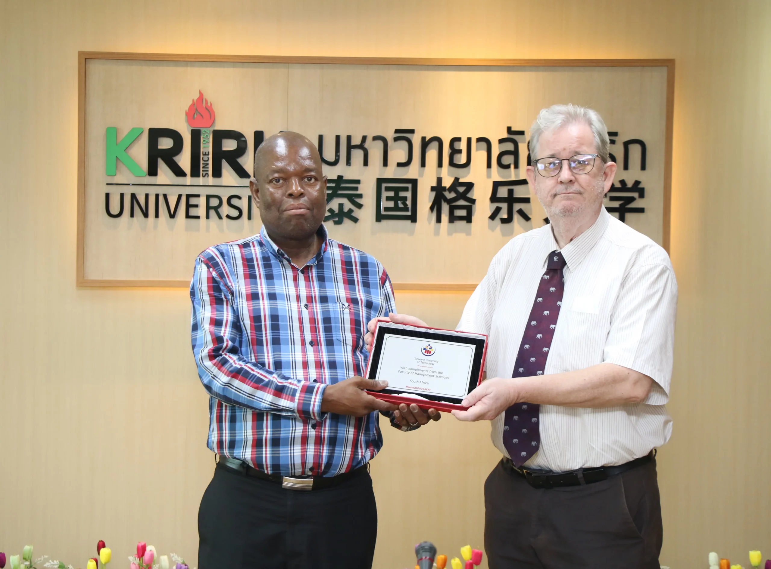 เมื่อวันพฤหัสบดีที่ 28 กุมภาพันธ์ 2567 ณ ห้องประชุมสภา มหาวิทยาลัยเกริก ได้รับเกียรติจาก ศ.ดร. จรัญ มะลูลีม รองอธิการบดีฝ่ายการต่างประเทศ ดร.บัณฑิต อารอมัน ผู้ช่วยรองอธิการบดีฝ่ายการต่างประเทศ อาจารย์ชนิดาภา หนูนวลวุฒิวงศ์ ผู้อำนวยการสำนักงานการต่างประเทศ DR. JOHN CHISTOPHER WALSH รองคณบดีวิทยาลัยนานาชาติ หลักสูตรภาษาอังกฤษ อาจารย์ศักดิธัช ฉมามหัทธนา อาจารย์ประจำสาขาวิชาภาษาไทยเพื่อการสื่อสาร คณะศิลปะศาสตร์ ตลอดจนบุคลากรและเจ้าหน้าที่ ร่วมให้การต้อนรับผู้บริหารจากมหาวิทยาลัย Tshwane University of Technology (TUT) ประเทศแอฟริกาใต้ โดยมี Prof. Johan de Jager ศาสตราจารย์ด้านการวิจัยและนวัตกรรม คณะวิทยาการจัดการ พร้อมด้วย Prof Edward Rankhumise ผู้ช่วยคณบดีวิทยาการการจัดการ
