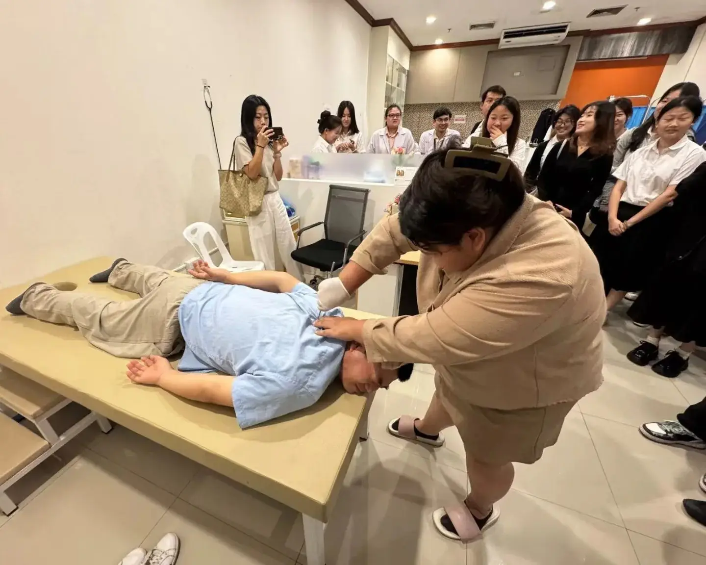 จากนั้นคณะศึกษาดูงานได้เยี่ยมชมแผนกผู้ป่วยนอกของคลินิกการแพทย์แผนจีนและคลินิกการแพทย์บูรณาการ ในระหว่างการเยี่ยมชม คณะศึกษาดูงานได้สัมผัสประสบการณ์รูปแบบการให้บริการทางการแพทย์ที่เป็นเอกลักษณ์ของที่นี่ แผนกผู้ป่วยนอกนี้ได้สร้างนวัตกรรมโดยผสมผสานจุดเด่นของการแพทย์แผนจีน แผนตะวันตก แผนไทย และการแพทย์อายุรเวท อาจารย์ผู้นำทีมได้ทดลองวิธีการรักษาพิเศษและได้ผลดี ซึ่งสร้างความสนใจอย่างมากให้กับนักศึกษา