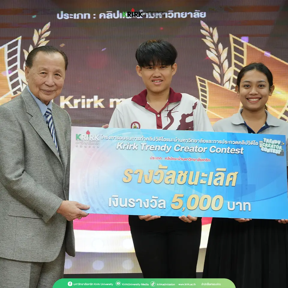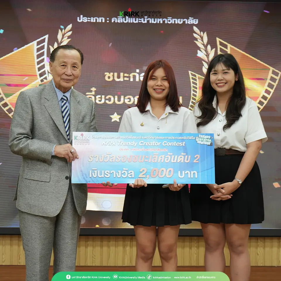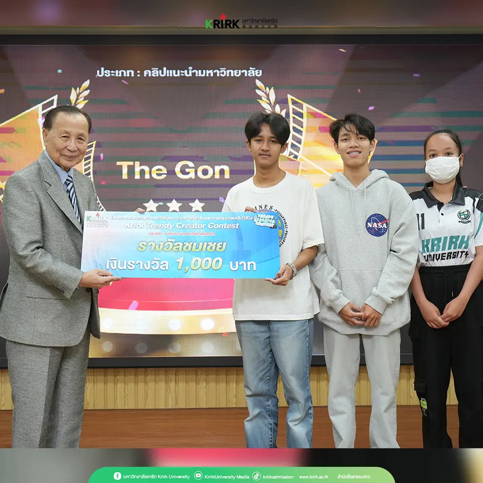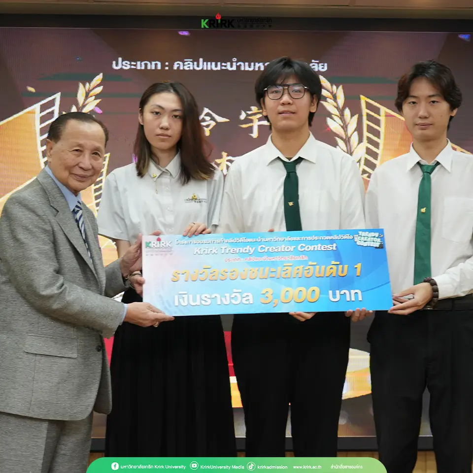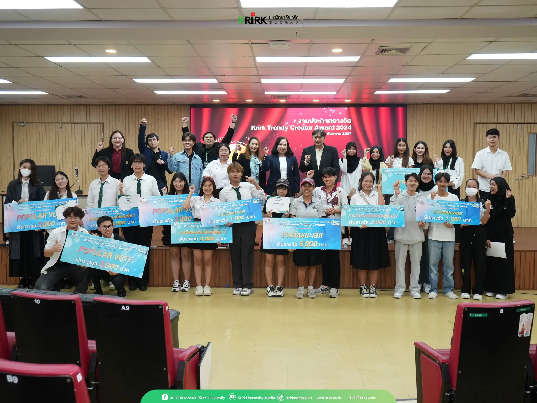 เมื่อวันศุกร์ที่ 13 ธันวาคม 2567 ที่ผ่านมา สำนักสื่อสารองค์กร มหาวิทยาลัยเกริก ได้จัดพิธีมอบรางวัล “Krirk Trendy Creator Contest” โดยได้จัดขึ้น ณ ห้องประชุม 2300 ซึ่งเป็นโครงการที่ให้นักศึกษาชาวมหาวิทยาลัยเกริก ได้ฝึกผลิตคลิปวีดีโอแนะนำมหาวิทยาลัยและแนะนำสาขาวิชา โดยใช้โทรศัพท์มือถือเป็นอุปกรณ์ในการผลิตและวีดีโอจะต้องเป็นแนวตั้ง เพื่อสามารถนำไปเผยแพร่ผ่านแพลตฟอร์ม Tiktok ได้ มีนักศึกษาเข้าร่วมทั้งสิ้น 18 ทีม แบ่งเป็นประเภทคลิปวีดีโอแนะนำมหาวิทยาลัย 14 คลิป และประเภทคลิปวีดีโอแนะนำสาขาวิชา 12 คลิป