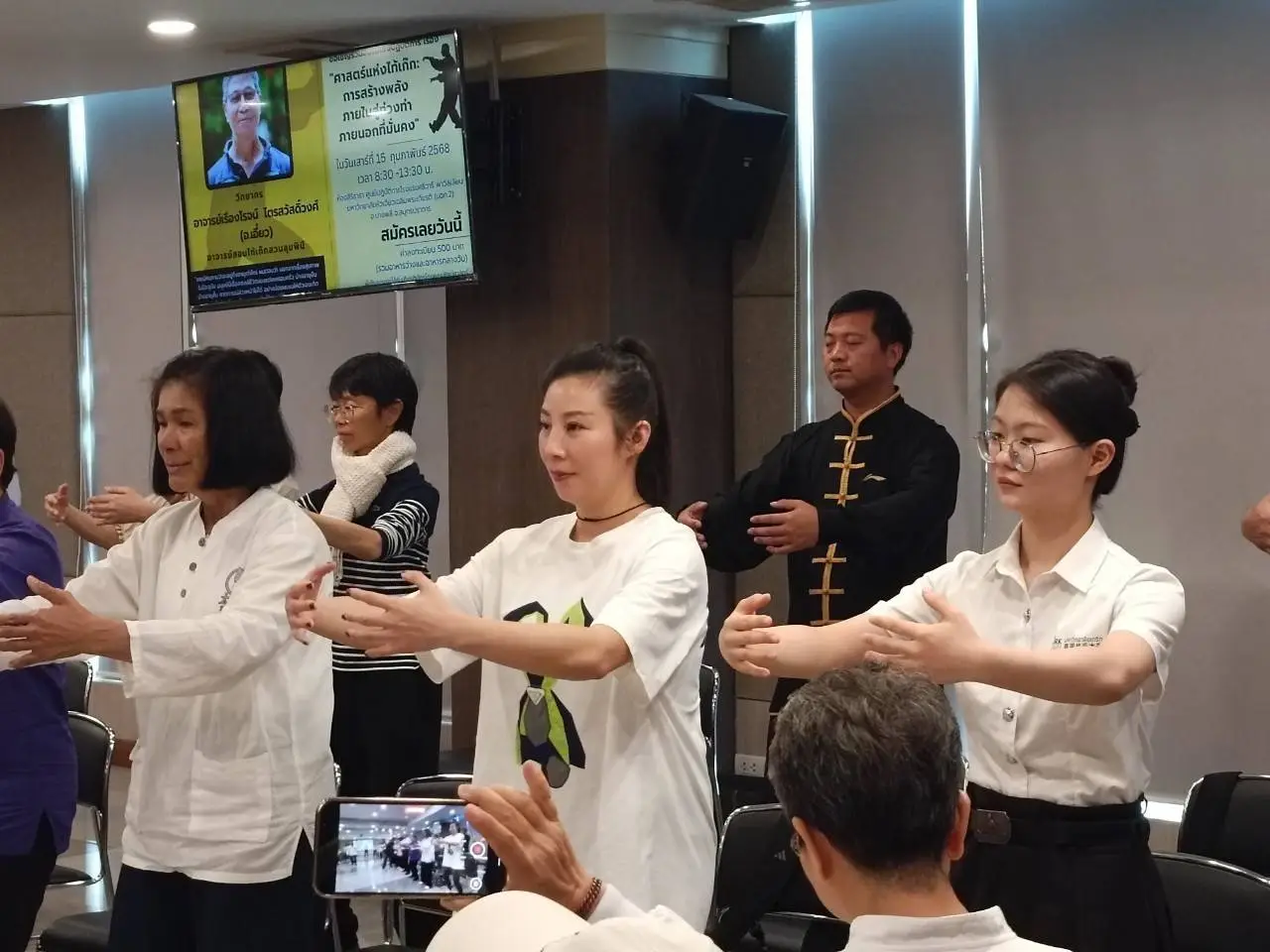 นอกจากการบรรยายแล้ว อาจารย์เรืองโรจน์ ยังได้ทำการสาธิตท่วงท่าต่าง ๆ ของไทเก๊ก และเชิญลูกศิษย์ของท่าน มาร่วมฝึกฝนและสาธิต “ทุ่ยโส่ว” (การผลักมือ) ร่วมกับผู้เข้าร่วมงาน เพื่อแสดงให้เห็นถึงความเชื่อมโยงของไท่เก๊กกับหลักปรัชญา การแพทย์ และกลศาสตร์ อ.ดร.จ้าวเย่ และ อ.ดร.แพทย์จีนสุภรตา เกียรติวิชญ์ ตัวแทนจากมหาวิทยาลัยเกริก ได้เข้าพบและเจรจากับท่านนายกสมาคมไทเก๊กแห่งประเทศไทย โดยทั้งสองฝ่ายได้บรรลุข้อตกลงร่วมกันในการจัด หลักสูตรอบรม กิจกรรมวิชาการ และการประชุมระดับนานาชาติในช่วงเดือนเมษายน พฤษภาคม และกรกฎาคม ซึ่งเป็นส่วนหนึ่งของกิจกรรมเฉลิมฉลองครบรอบ 50 ปีความสัมพันธ์ทางการทูตไทย-จีน