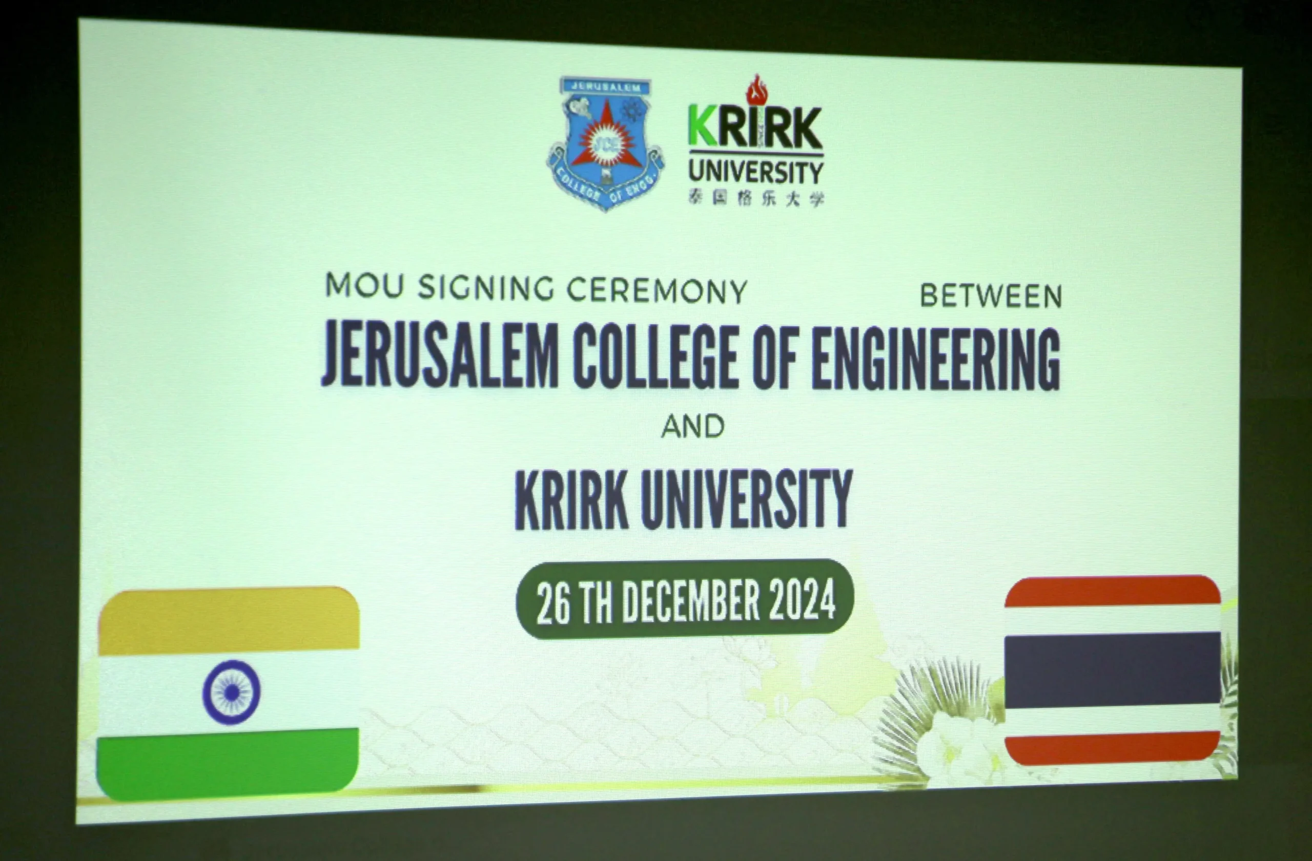 Jerusalem College of Engineering (JCE) เป็นสถาบันการศึกษาชั้นนำของประเทศอินเดียที่มีความเชี่ยวชาญด้านวิศวกรรมศาสตร์และเทคโนโลยีและมีความมุ่งมั่นในการพัฒนานวัตกรรมเพื่อสร้างประโยชน์แก่สังคม ความร่วมมือครั้งนี้นับเป็นการผสานพลังแห่งความรู้ที่มีศักยภาพสูง ถือเป็นอีกหนึ่งก้าวสำคัญของมหาวิทยาลัยเกริกในการเสริมสร้างเครือข่ายความร่วมมือด้านการศึกษานานาชาติโดยเฉพาะในภูมิภาคเอเชียใต้ อันจะช่วยเพิ่มศักยภาพในการผลิตบัณฑิตที่มีคุณภาพและความพร้อมสู่การเป็นพลเมืองที่มีประสิทธิภาพในอนาคต
