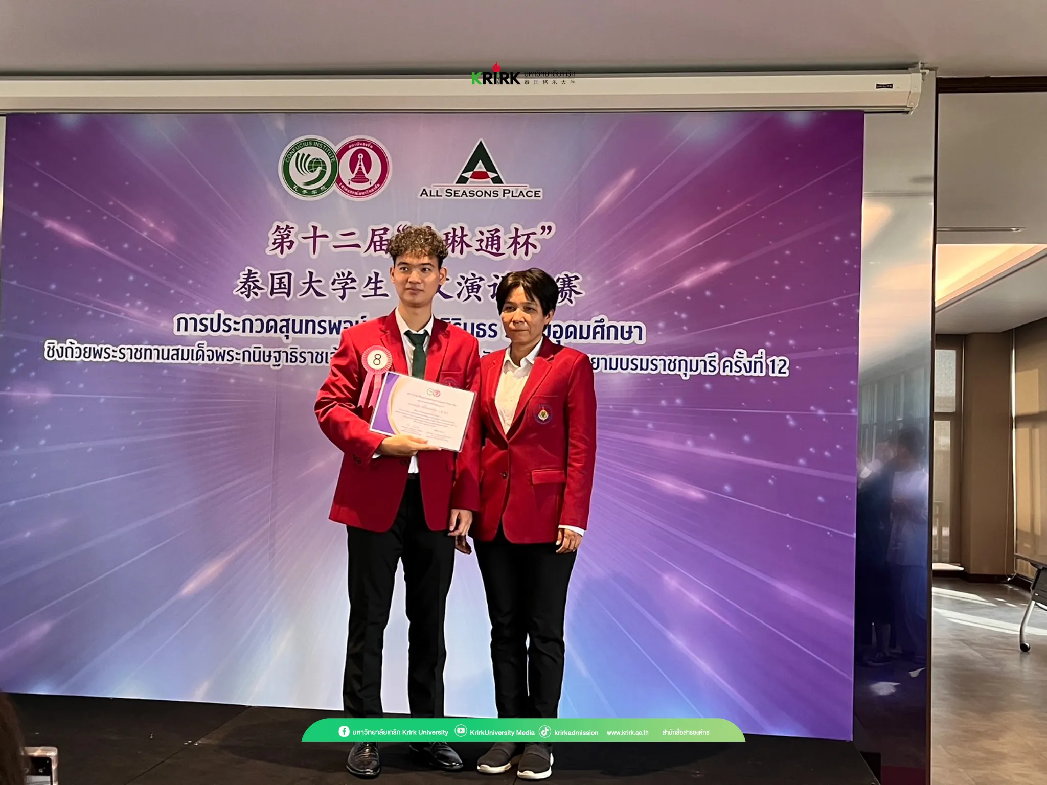 มหาวิทยาลัยเกริก ขอแสดงความยินดีแก่ นายแทนไท รัตติกรวรสกุล (天文) นักศึกษาสาขาวิชาภาษาจีนธุรกิจ ชั้นปีที่ 3 วิทยาลัยนานาชาติภาษาและวัฒนธรรมจีน ในโอกาสได้รับรางวัลได้รับรางวัลรองชนะเลิศอันดับ 1 จากการประกวดสุนทรพจน์ภาษาจีนสิรินธร ระดับอุดมศึกษา ชิงถ้วยพระราชทานสมเด็จพระกนิษฐาธิราชเจ้า กรมสมเด็จพระเทพรัตนราชสุดาฯ สยามบรมราชกุมารี ครั้งที่ 12 2565 จัดโดยสถาบันขงจื่อแห่งจุฬาลงกรณ์มหาวิทยาลัย