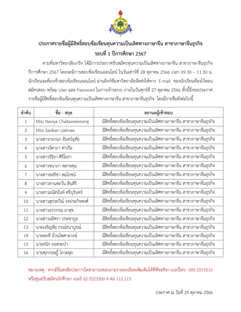 ประกาศรายชื่อผู้มีสิทธิ์สอบสัมภาษณ์ ทุนความเป็นเลิศทางภาษาจีน สาขาภาษาจีนธุรกิจ ครั้งที่ 1 ปีการศึกษา 2567 ตามที่มหาวิทยาลัยเกริก ได้มีการประกาศรับสมัครทุนความเป็นเลิศทางภาษาจีน สาขาภาษาจีนธุรกิจ ปีการศึกษา 2567 โดยจะมีการสอบข้อเขียนออนไลน์ ในวันเสาร์ที่ 28 ตุลาคม 2566 เวลา 09.30 – 11.30 น. นักเรียนจะต้องเข้าสอบข้อเขียนออนไลน์ ผ่านลิงก์ที่มหาวิทยาลัยจัดส่งให้ทาง E-mail ของนักเรียนที่ลงไว้ตอนสมัครสอบ พร้อม User และ Password ในการเข้าระบบ ภายในวันศุกร์ที่ 27 ตุลาคม 2566 ทั้งนี้จึงขอประกาศรายชื่อผู้มีสิทธิ์สอบข้อเขียนทุนความเป็นเลิศทางภาษาจีน สาขาภาษาจีนธุรกิจ โดยมีรายชื่อดังต่อไปนี้ หมายเหตุ : หากมีข้อสงสัยประการใดสามารถสอบถามรายละเอียดเพิ่มเติมได้ที่พี่ชลธิชา เบอร์โทร : 095-2515510 หรือศูนย์รับสมัครนักศึกษา เบอร์ 02-5523500-9 ต่อ 112,113