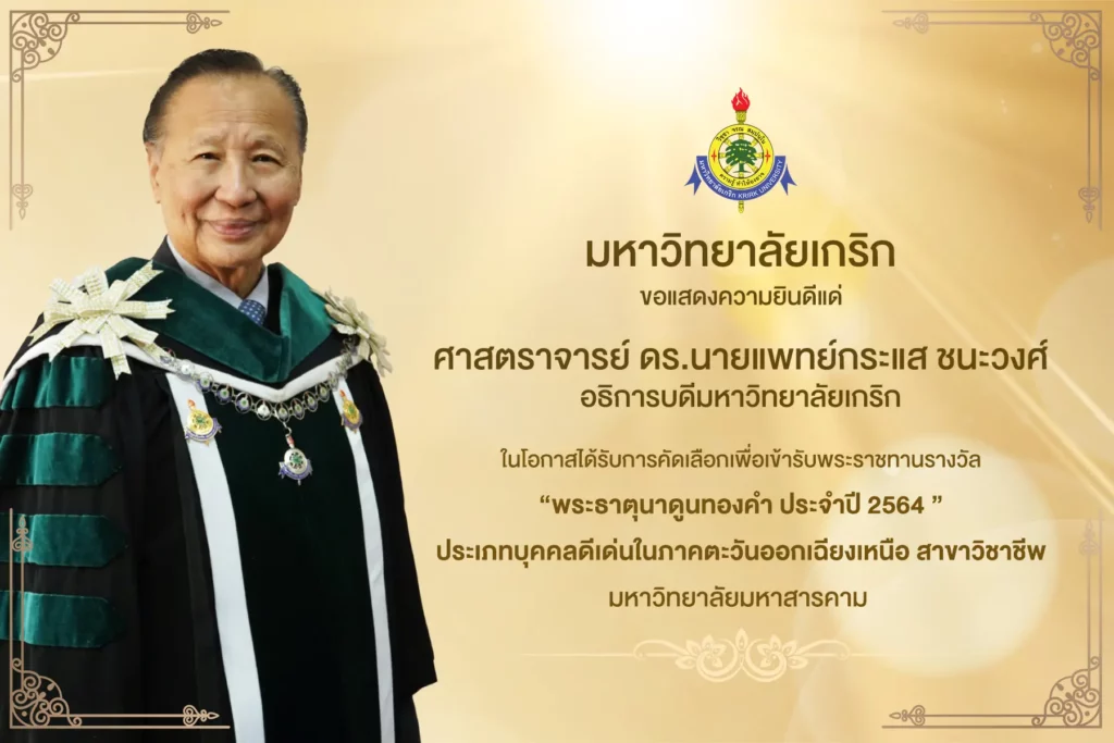 ศาสตราจารย์ ดร.นายแพทย์กระแส ชนะวงศ์ อธิการบดีมหาวิทยาลัยเกริก ได้รับการคัดเลือกเพื่อเข้ารับพระราชทานรางวัล “พระธาตุนาดูนทองคำ”