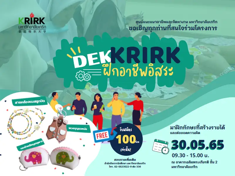 ขอเชิญชวนอาจารย์ บุคลากร และนักศึกษามหาวิทยาลัยเกริก ร่วมโครงการ DEK KRIRK ฝึกอาชีพอิสระ ในวันที่ 30 พฤษภาคม 2565