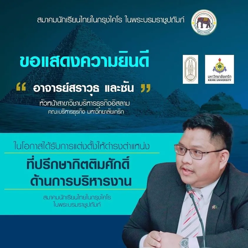 ขอแสดงความยินดีกับ อาจารย์สราวุธ และซัน ได้รับการแต่งตั้งให้ดำรงตำแหน่ง ที่ปรึกษากิตติมศักดิ์ด้านการบริหารงาน สมาคมนักเรียน ไทยในกรุงไคโร ในพระบรมราชูปถัมภ์