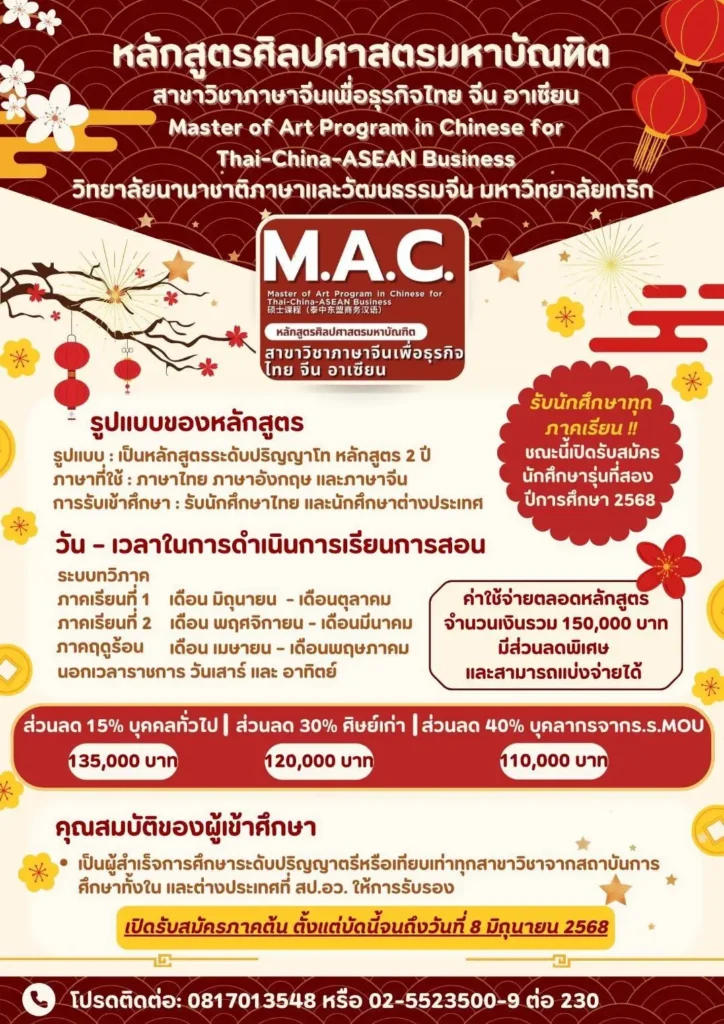 เปิดรับสมัครแล้ว หลักสูตรศิลปศาสตรมหาบัณฑิต สาขาวิชาภาษาจีนเพื่อธุรกิจไทย-จีน-อาเซียน