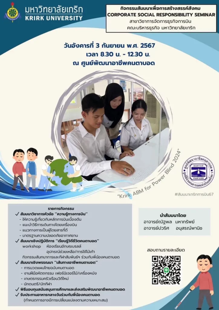 มหาวิทยาลัยเกริก ได้มอบทุนการศึกษา และ ทุนส่งเสริมพัฒนาอาชีพผู้พิการทางสายตา ในโครงการ “Krirk ABM for Power Blind”