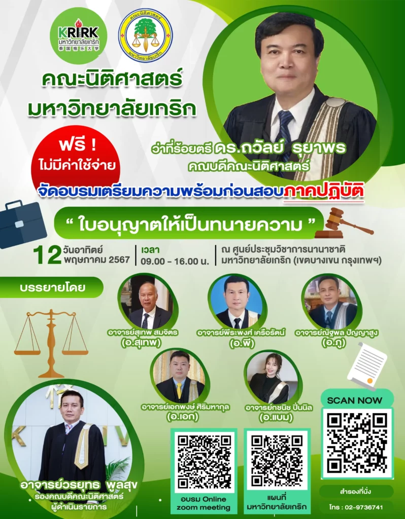 คณะนิติศาสตร์ มหาวิทยาลัยเกริก ขอเชิญเข้าร่วมอบรมเตรียมความพร้อมก่อนสอบภาคปฏิบัติในหัวข้อ “ใบอนุญาตเป็นทนายความ”
