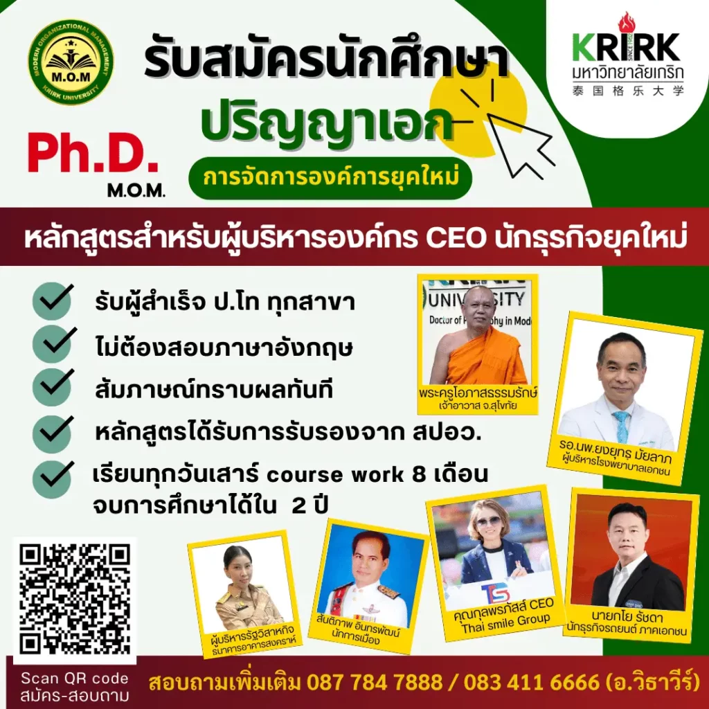 หลักสูตรปรัชญาดุษฎีบัณฑิต สาขาวิชาการจัดการองค์การยุคใหม่ เปิดรับสมัครนักศึกษาปริญญาเอกรุ่นที่ 3 สมัครได้ตั้งแต่วันนี้ รับจำนวนจำกัด เพียง 25 ท่าน