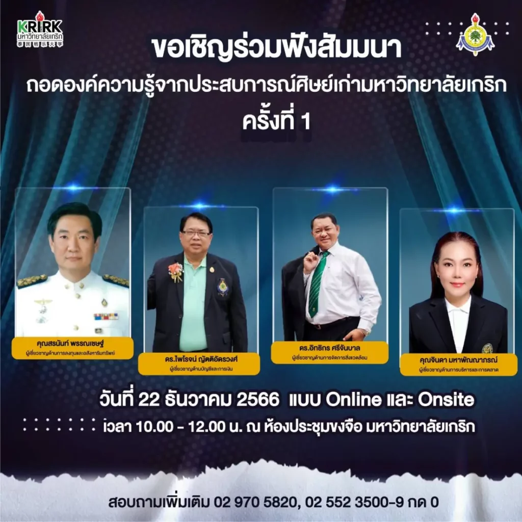 มหาวิทยาลัยเกริก ร่วมกับ สมาคมศิษย์เก่ามหาวิทยาลัยเกริก ขอเชิญชวนศิษย์เก่าและบุคคลทั่วไปที่สนใจร่วมฟังสัมมนาหัวข้อ “ถอดองค์ความรู้จากประสบการณ์ศิษย์เก่า ครั้งที่ 1”