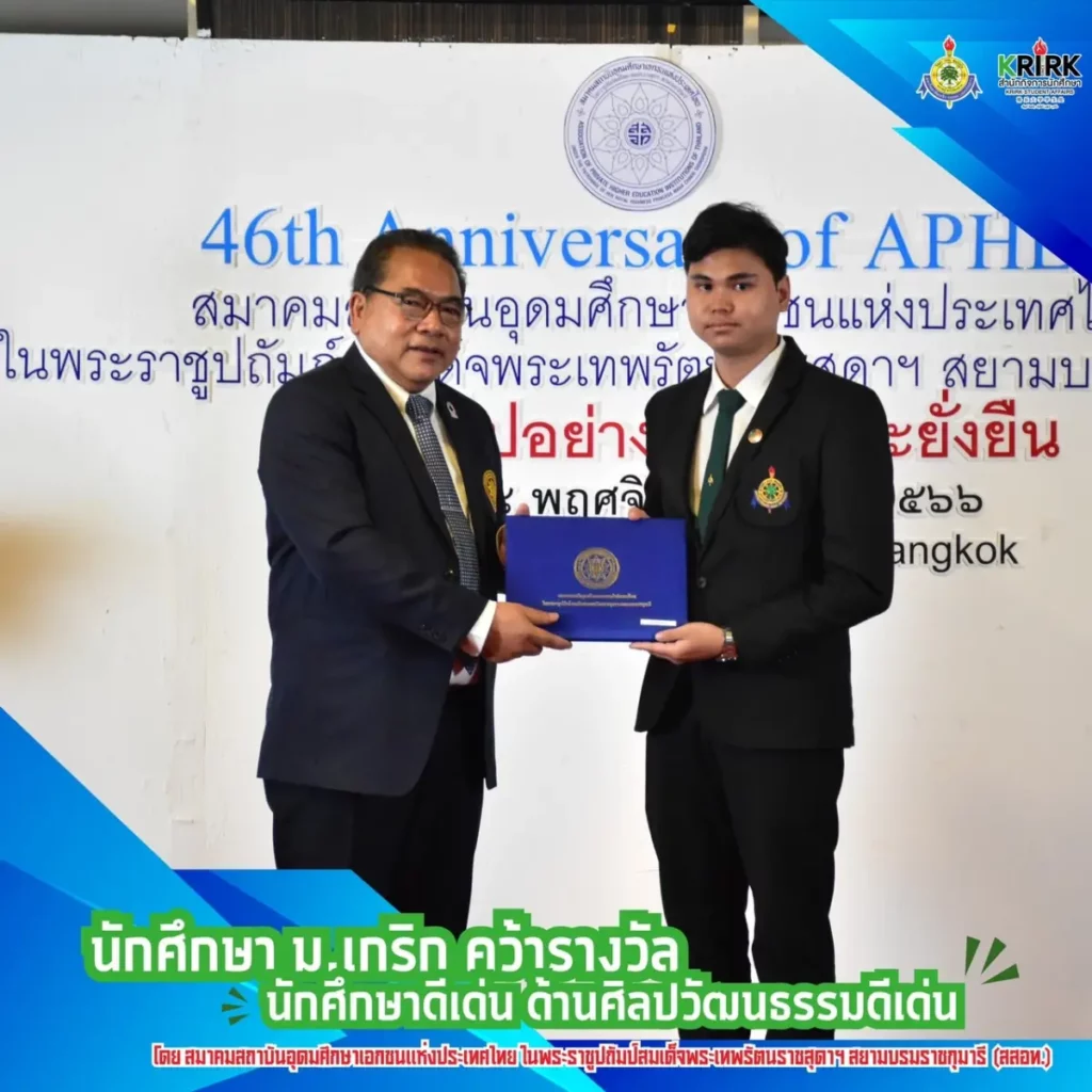 นักศึกษาคณะนิติศาสตร์ มหาวิทยาลัยเกริก เข้ารับรางวัลนักศึกษาดีเด่น ด้านศิลปวัฒนธรรมดีเด่น จัดโดย สมาคมสถาบันอุดมศึกษาเอกชนแห่งประเทศไทย ในพระบรมราชูปถัมภ์สมเด็จพระเทพรัตนราชสุดาฯ สยามบรมราชกุมารี