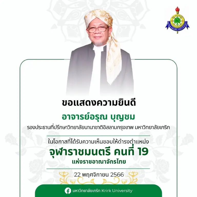 ขอแสดงความยินดีแด่ อาจารย์อรุณ บุญชม รองประธานที่ปรึกษาวิทยาลัยนานาชาติอิสลามกรุงเทพ มหาวิทยาลัยเกริก เนื่องในโอกาสที่ได้รับความเห็นชอบให้ดำรงตำแหน่ง จุฬาราชมนตรี คนที่ 19 แห่งราชอาณาจักรไทย
