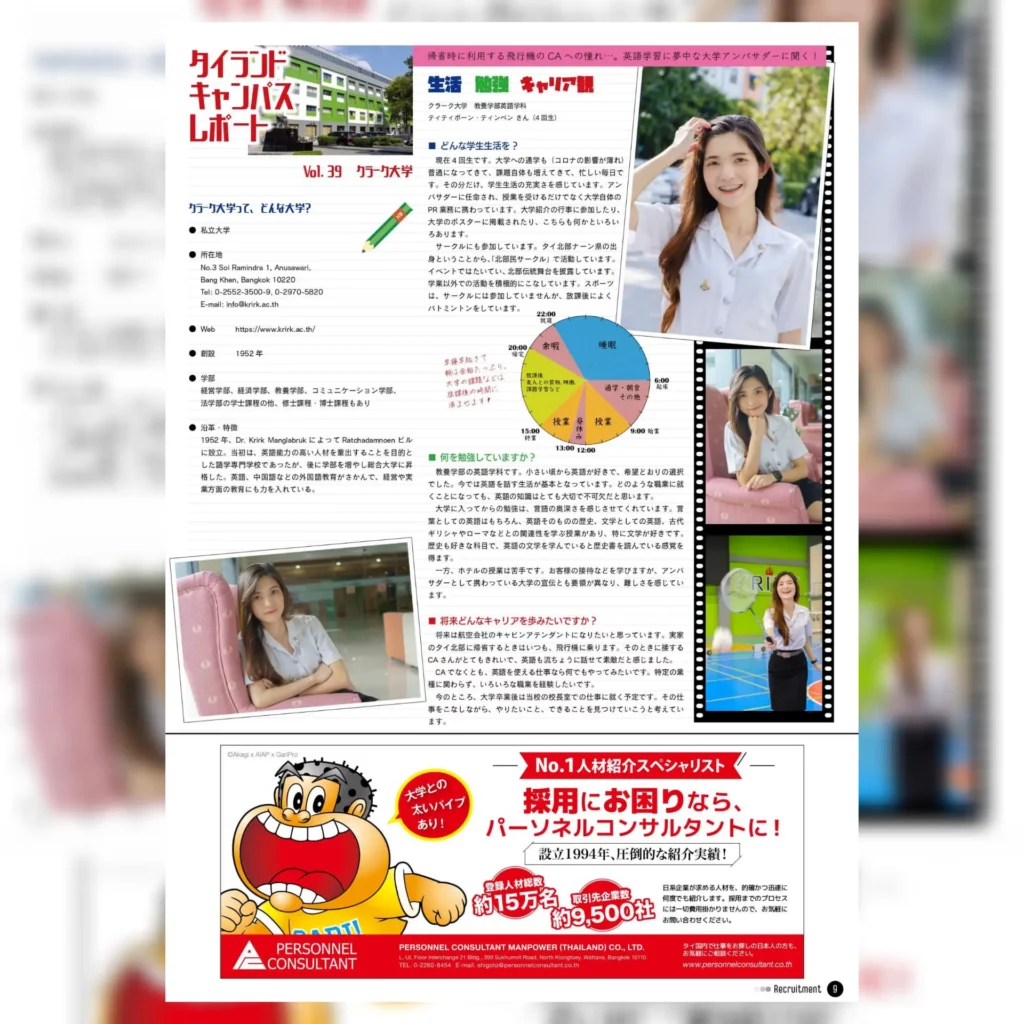 บทสัมภาษณ์ น้องฟ้าใส นางสาวธิติพร ทองเพ็ญ นักศึกษาชั้นปีที่ 4 สาขาภาษาอังกฤษ คณะศิลปศาสตร์ ใน นิตยสารภาษาญี่ปุ่นรายเดือน ฉบับใหม่ “PANORA” ฉบับประเทศไทย