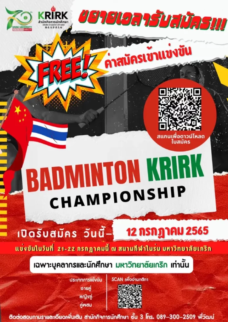 ขยายเวลารับสมัค กิจกรรมการแข่งขันแบดมินตันเกริก แชมเปี้ยนชิพ ไปจนถึงวันที่ 12 กรกฎาคม 2565 ฟรีค่าสมัคร