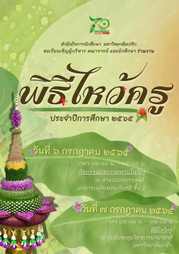 สำนักกิจการนักศึกษามหาวิทยาลัยเกริก ขอเชิญผู้บริหาร คณาจารย์บุคลากร และนักศึกษาทุกระดับชั้นปี ร่วมพิธีไหว้ครู ประจำปีการศึกษา 2565
