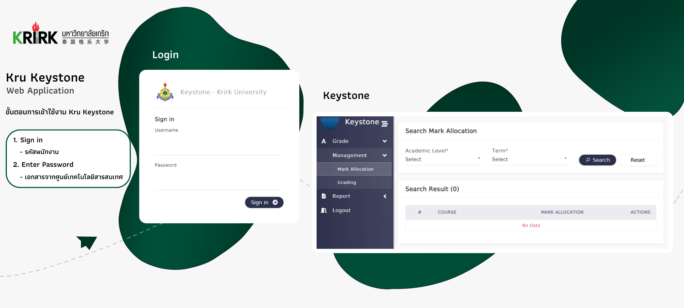 คู่มือ | – เมนูระบบสารสนเทศสำหรับอาจารย์ การตัดเกรด การสร้างรายวิชาสำหรับลงทะเบียน รายงานข้อมูลสารสนเทศ |